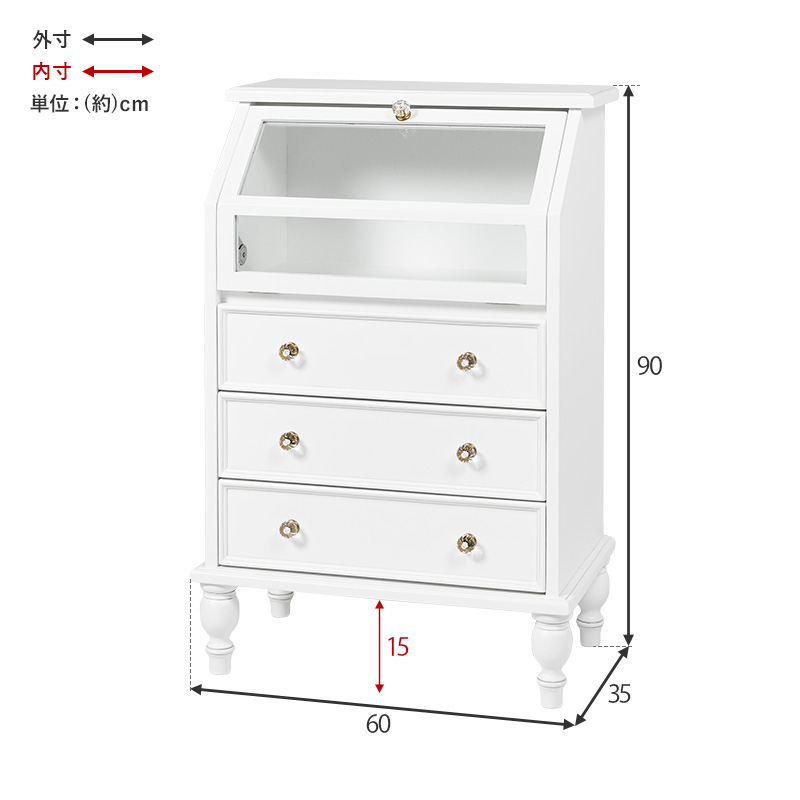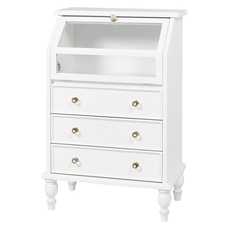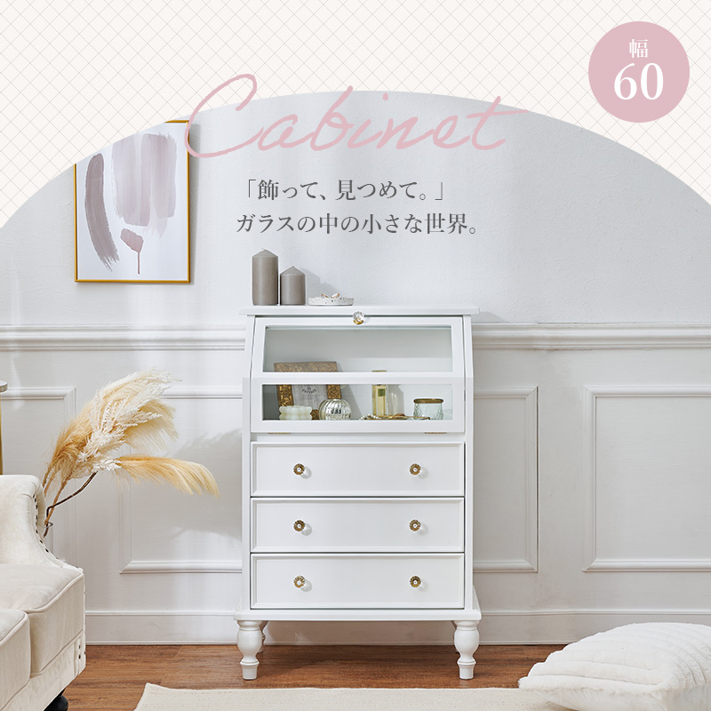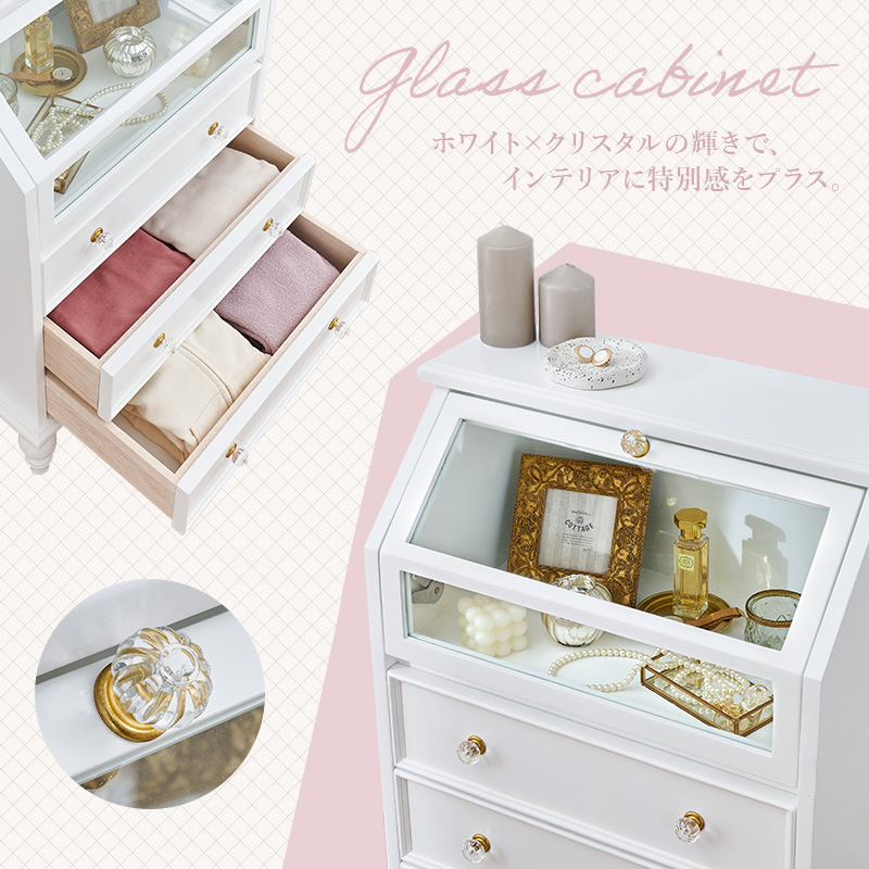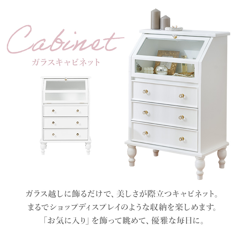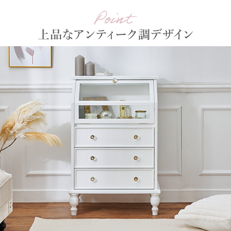 キラキラ取っ手で可愛さ倍増!引き出しの上はガラス張りのフラップ扉なので、お洒落に見せる収納ができるアンティーク風キャビネット