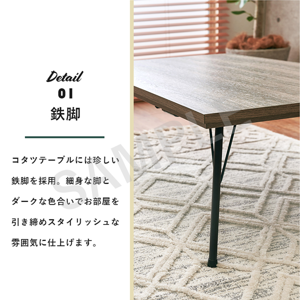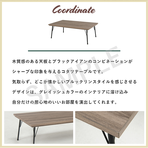 グレイッシュな木目調天板とスチール脚がブルックリンスタイルを感じさせるコタツテーブル。