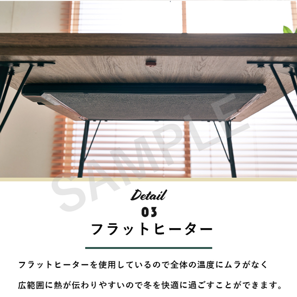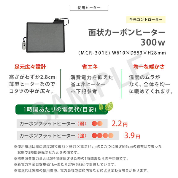| 素材 | 天板:合成樹脂化粧繊維板(PVCシート)、脚部:スチール、ヒーター:MCR-301E 300Wフラットカーボンヒーター(手元コントローラー付) |