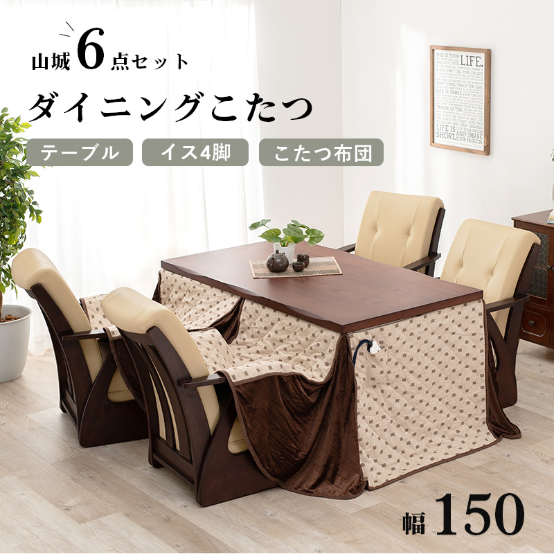届いた日に使えるダイニングこたつ6点セット。天板、脚に和風のなぐり加工を施した高級感あふれるダイニングこたつテーブル。座る環境に合わせて天板高さを4段階に調節可能な多段継脚タイプです。