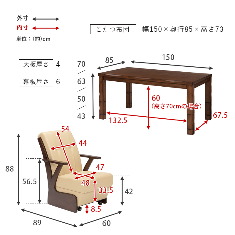 サイズ | コタツ:(約)幅150×奥行85×高さ43/50/63/70cm、チェア:(約)幅60×奥行89×高さ88×座面高42cm、薄掛け布団:(約)幅150×奥行85×高さ73cm |