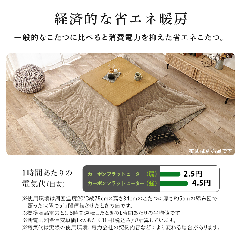 | 素材 | 天板:<ナチュラル>アッシュ突板<ブラウン>ウォールナット突板、塗装:ウレタン樹脂塗装(UV加工)、ヒーター:MCR-301E カーボンフラットヒーター(手元電子コントローラー) |