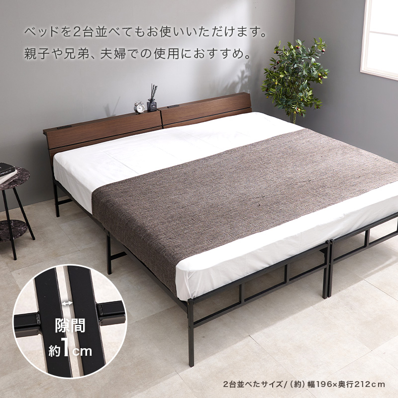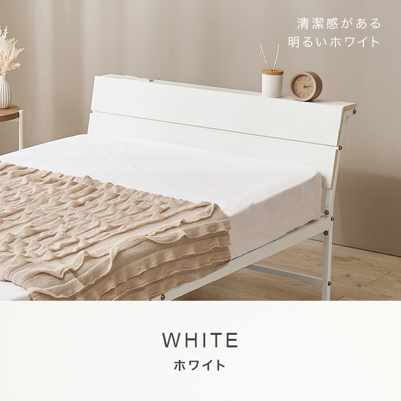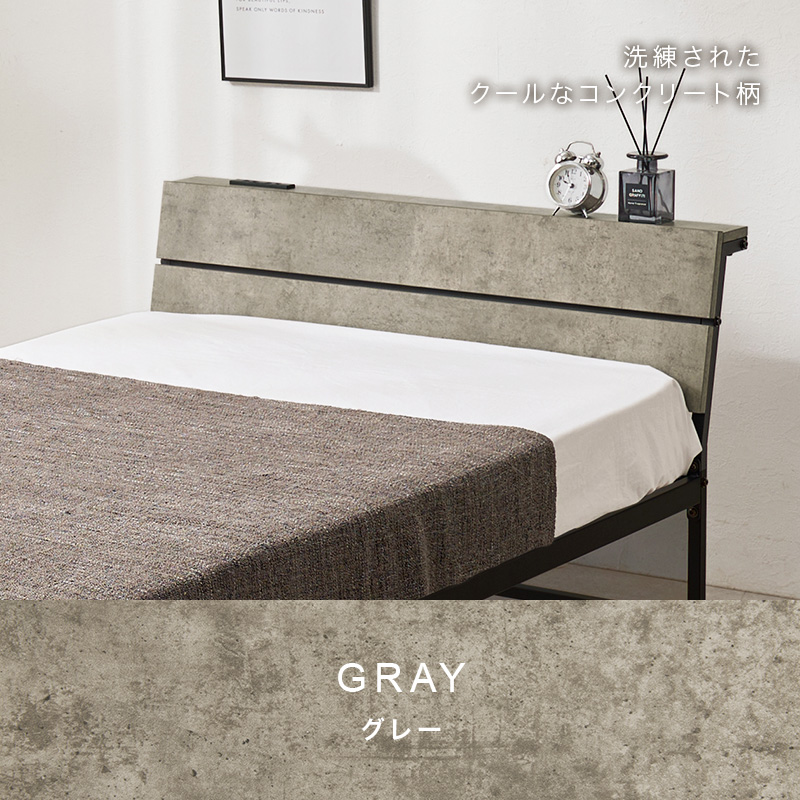 スチールフレームでスッキリとした印象のシングルベッド。ヘッドボードは傾斜があるパネル仕様です。便利な2口コンセント付き