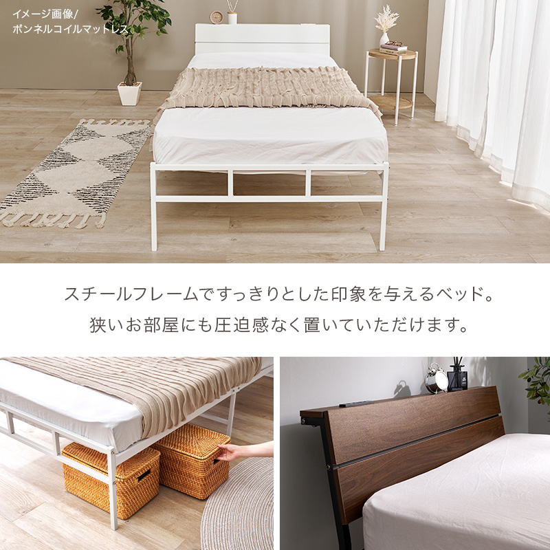 スチールフレームでスッキリとした印象のシングルベッド。ヘッドボードは傾斜があるパネル仕様です。体型に沿うように点で支え、体圧を分散するポケットコイルマットレスセット