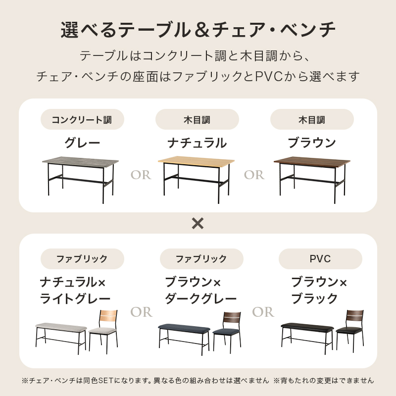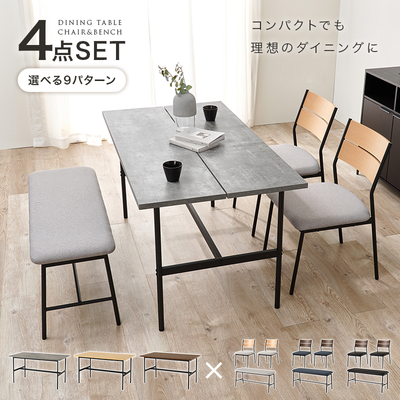 サイズ | テーブル:(約)幅135×奥行75×高さ71.5cm、チェア:(約)幅47×奥行53×高さ79×座面高43cm、ベンチ:(約)幅102×奥行37×高さ43cm |