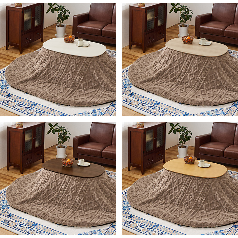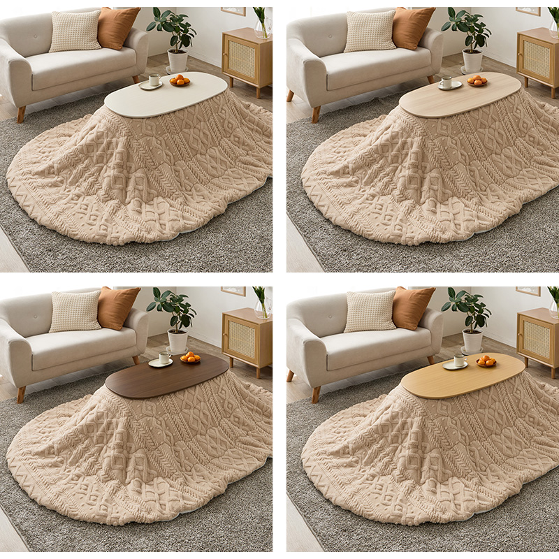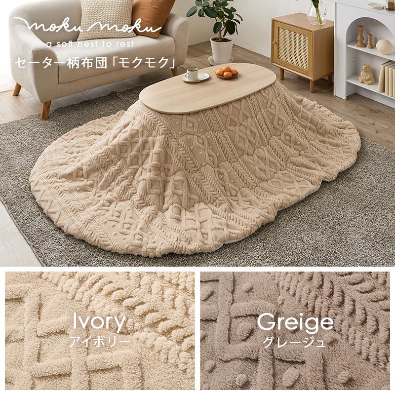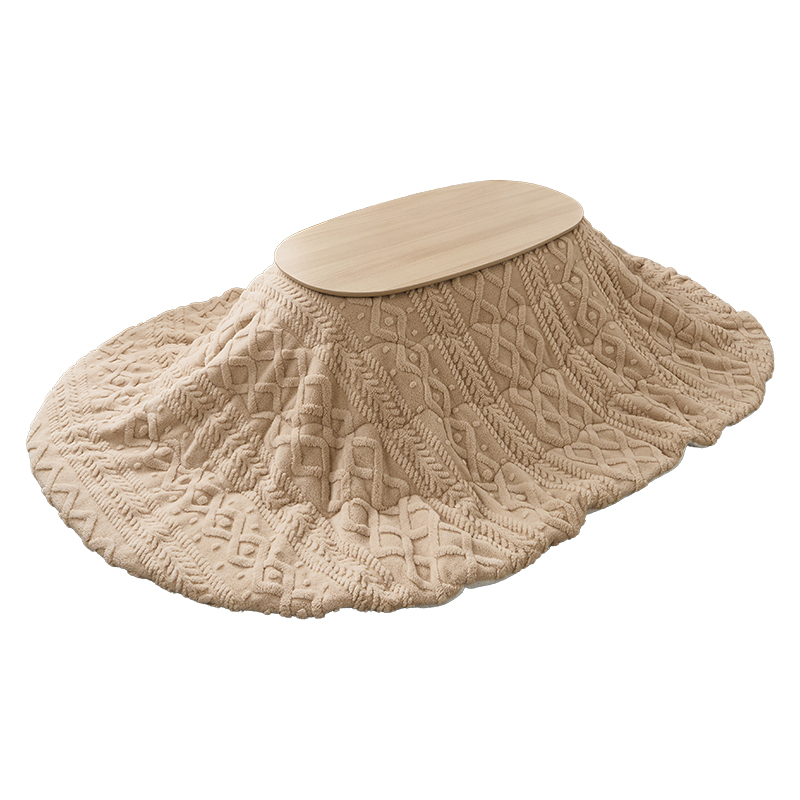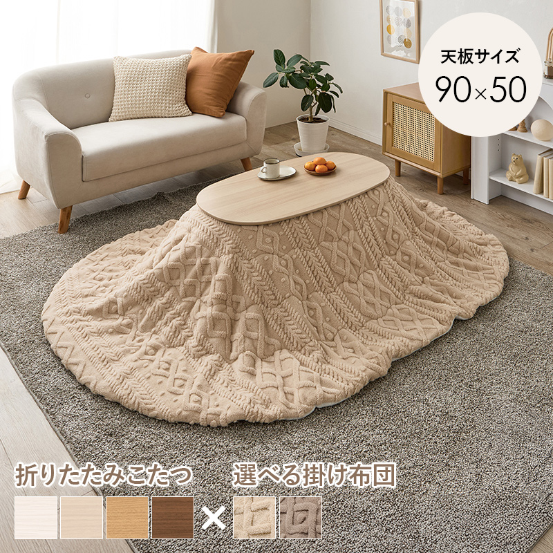 一人暮らしに最適なコンパクトサイズの折れ脚こたつテーブル。セーターのような立体的なデザインがおしゃれな掛け布団セット