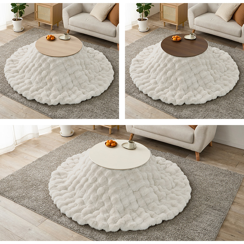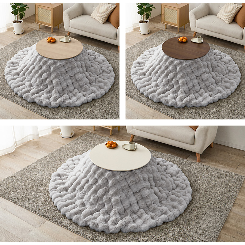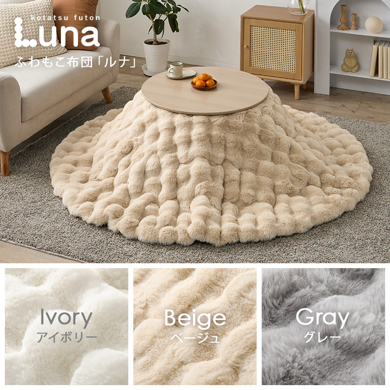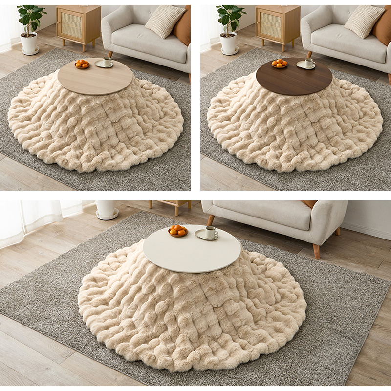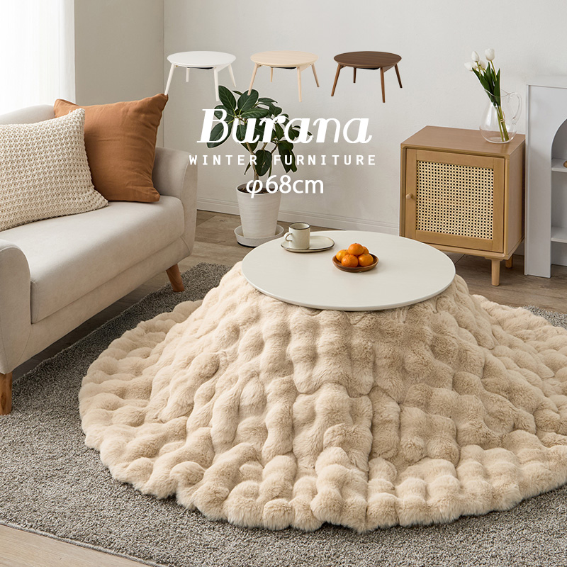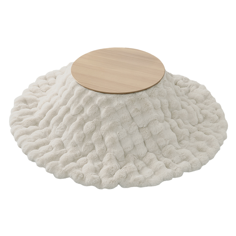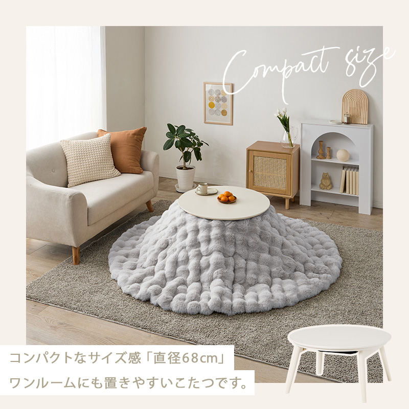 まるくてかわいいフォルムが特徴の丸型こたつ。コンパクトに収納できる折れ脚タイプ。ラビットファーのような、ふわもこの掛け布団セット