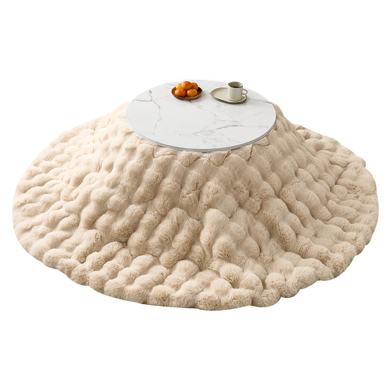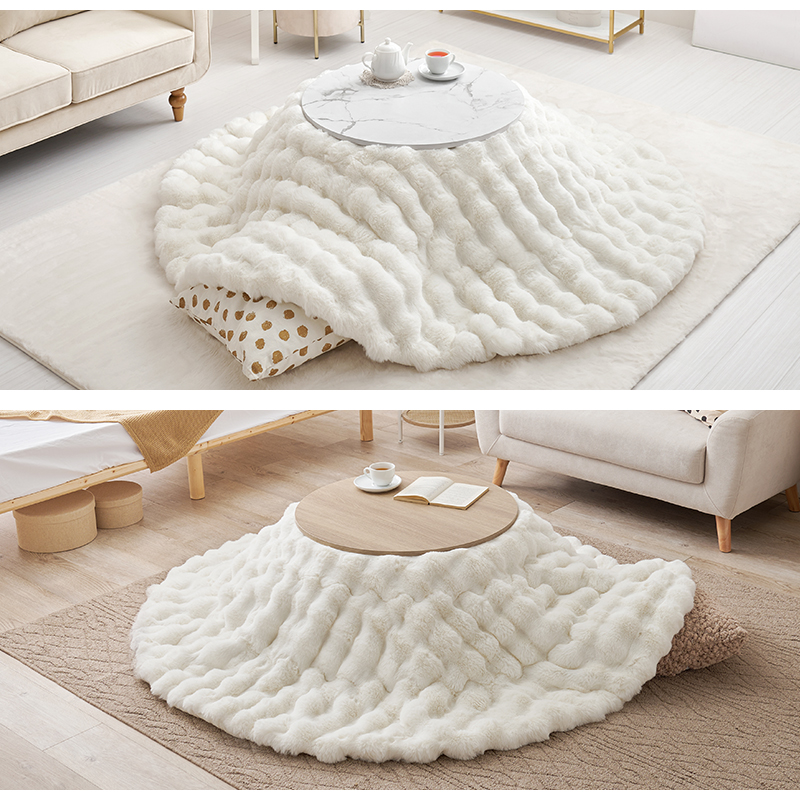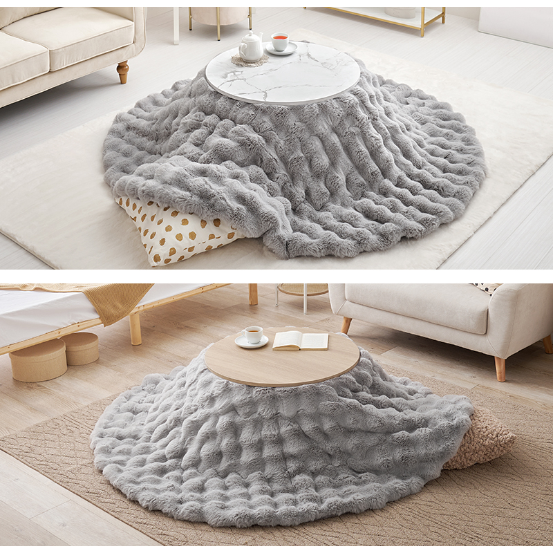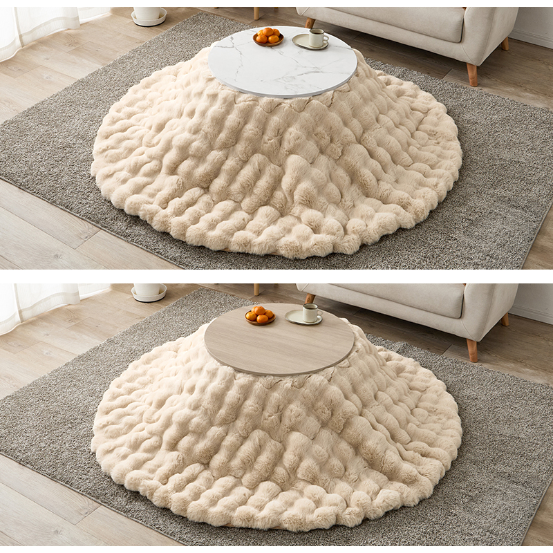 柔らかい印象を与える丸形天板のおしゃれなコンパクトこたつ。ラビットファーのような、ふわもこの掛け布団セット