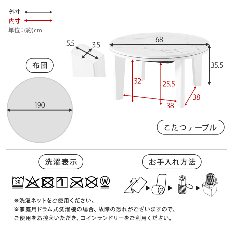 サイズ | こたつ:(約)幅68×奥行68×高さ35.5cm、掛けふとん:φ190cm |