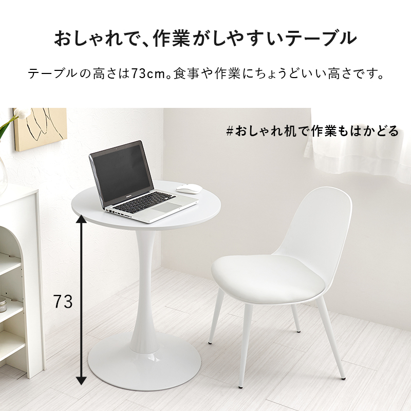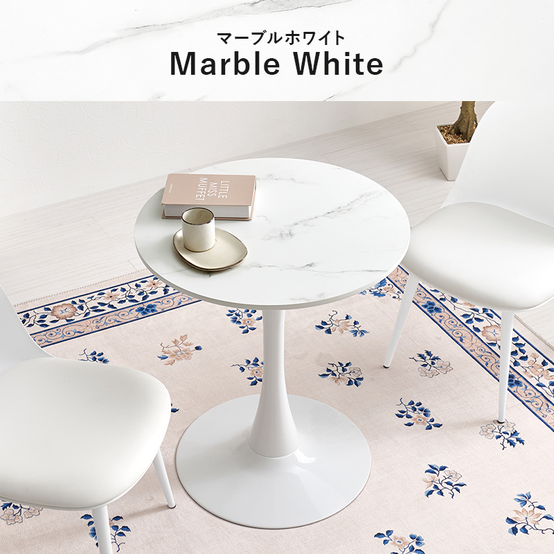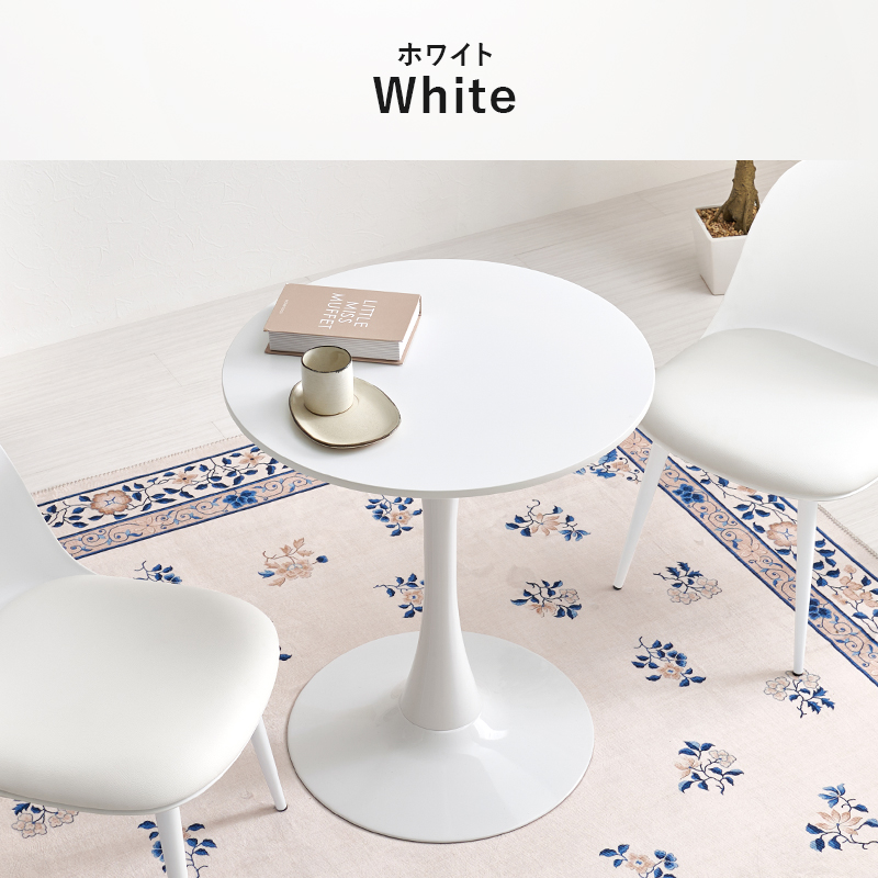 ホワイトインテリアの主役にピッタリな円形テーブル。滑らかな曲線が美しいスッキリとした1本脚タイプは、座る場所を選ばず使いやすい。