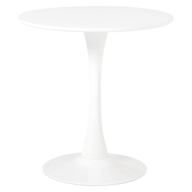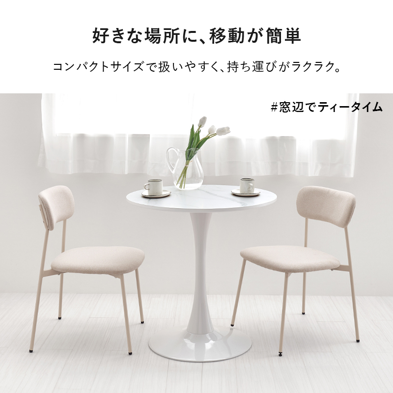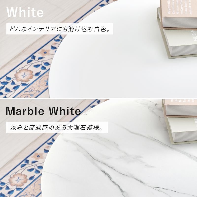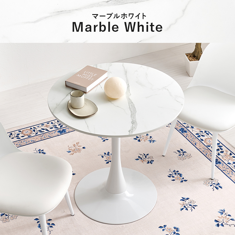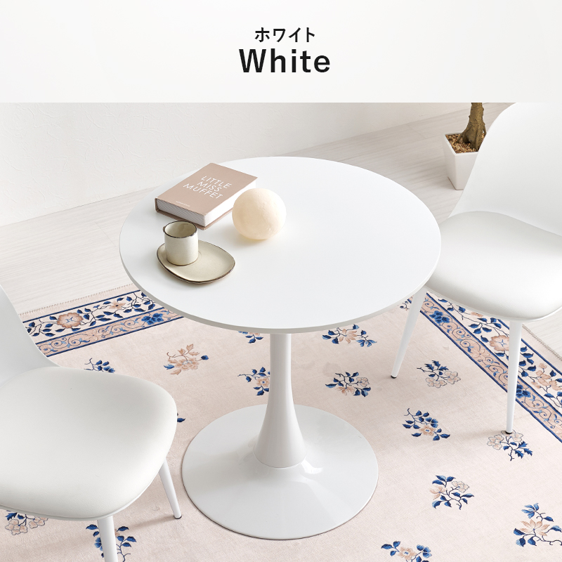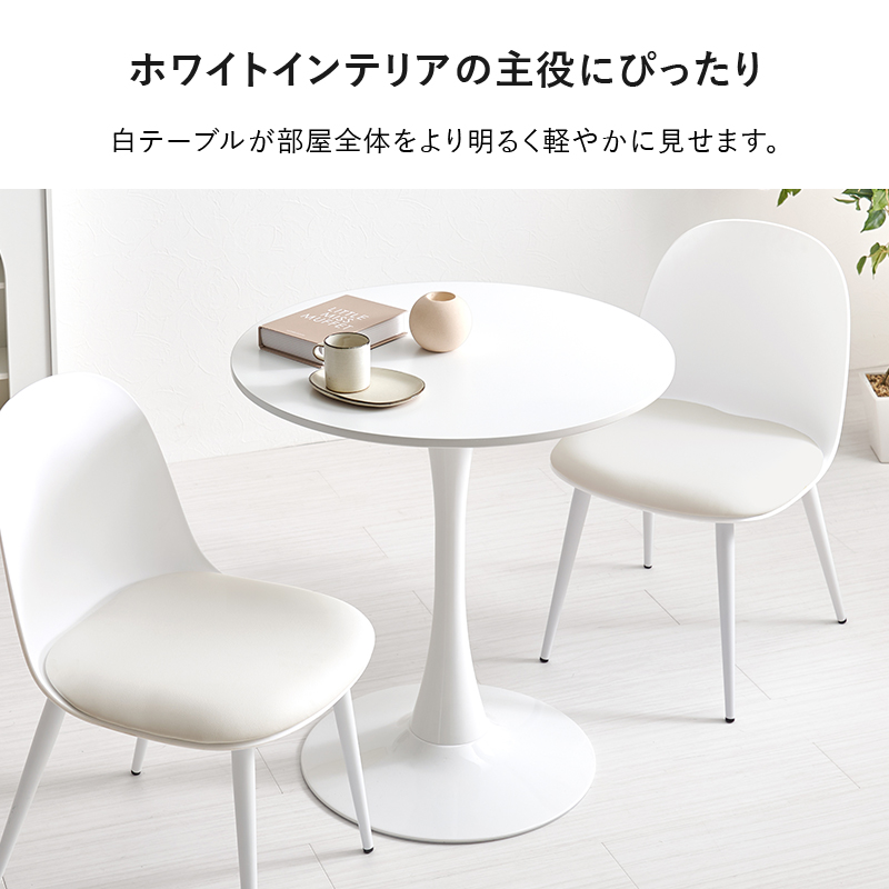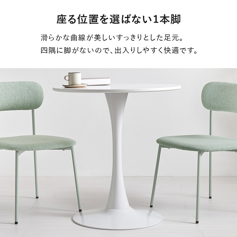 ホワイトインテリアの主役にピッタリな円形テーブル。滑らかな曲線が美しいスッキリとした1本脚タイプは、座る場所を選ばず使いやすい。