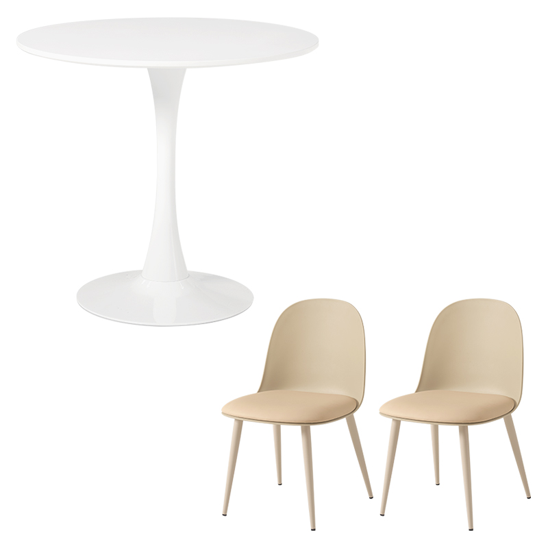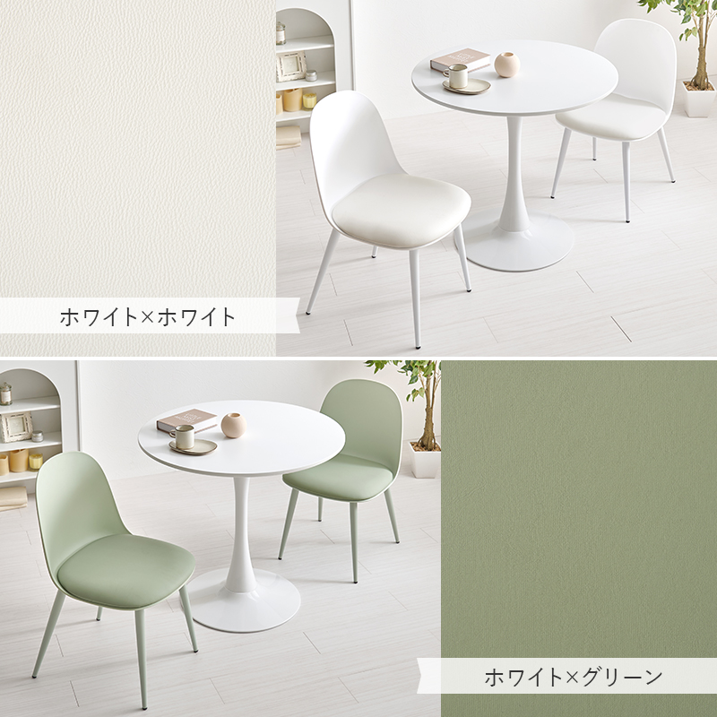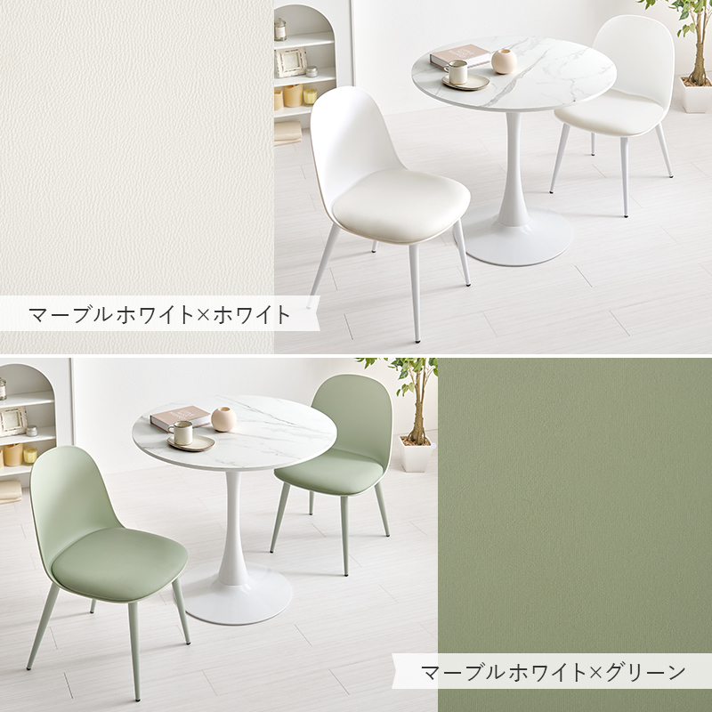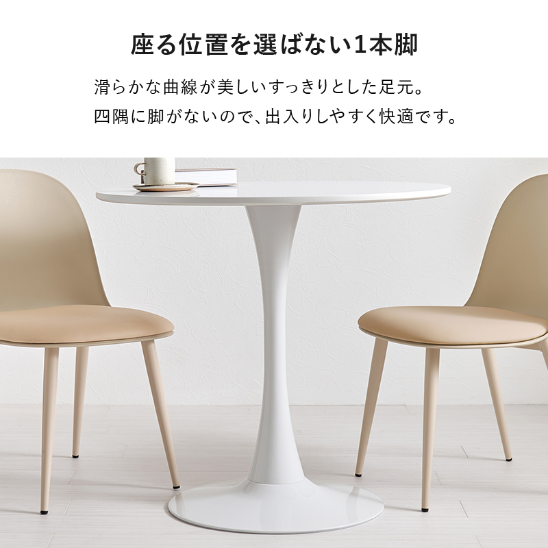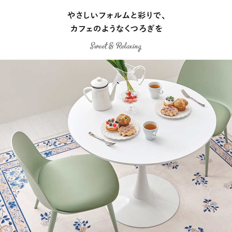 滑らかな曲線が美しいスッキリとした1本脚の円形テーブルに、くすみカラーと丸いフォルムがかわいいデザインのチェアを合わせました。
