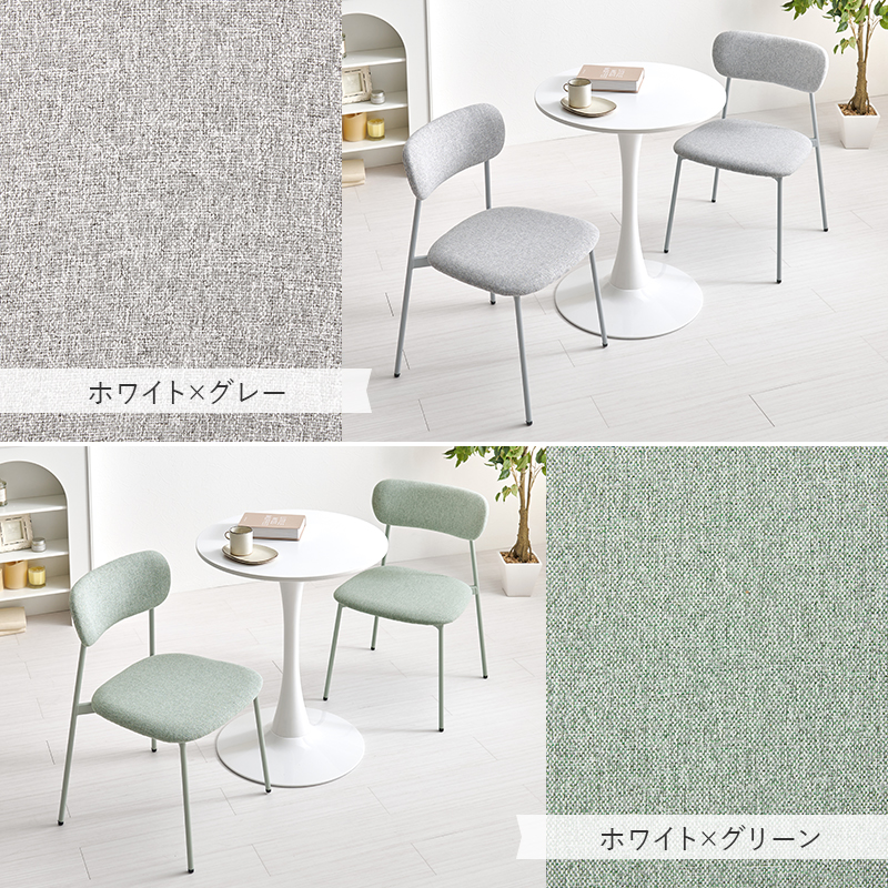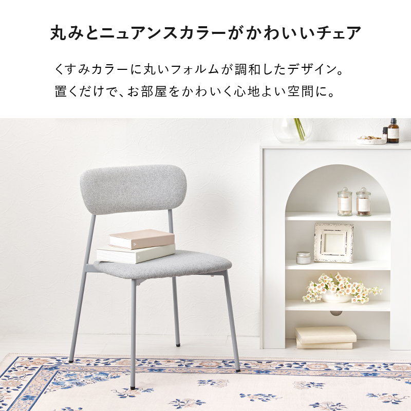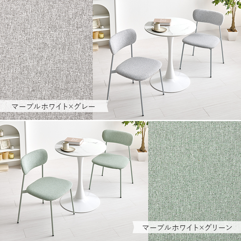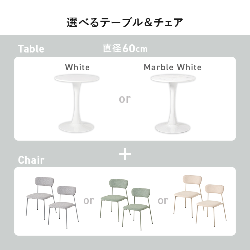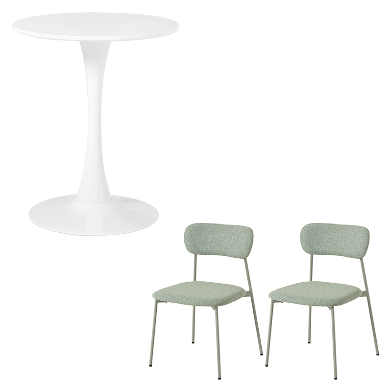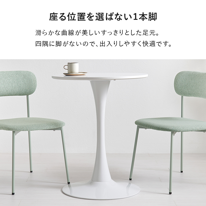 滑らかな曲線が美しいスッキリとした1本脚の円形テーブルに、くすみカラーと丸いフォルムがかわいいデザインのチェアを合わせました。