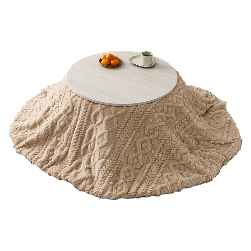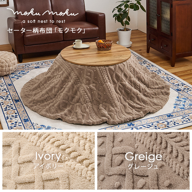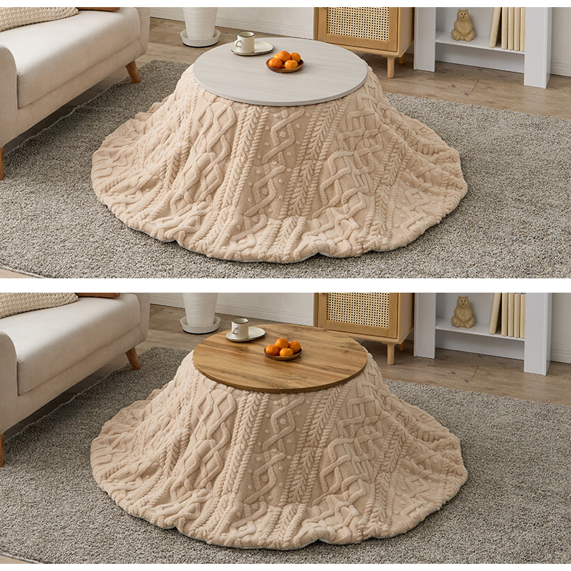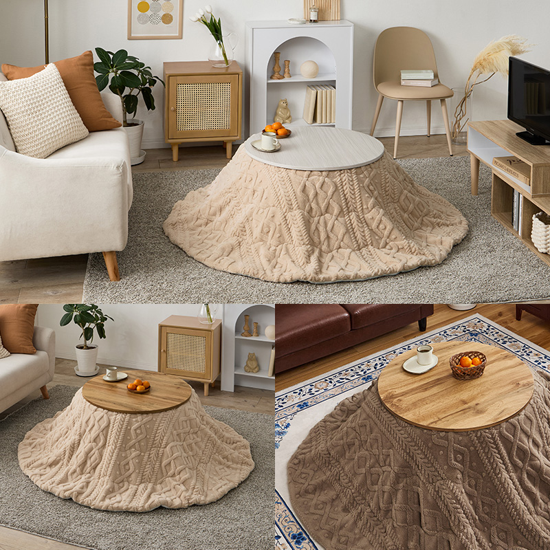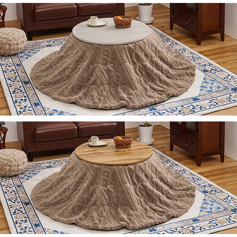 脚は折りたたんで隙間に収納も可能なコンパクト円形こたつ。セーターのような立体的なデザインがおしゃれな掛け布団セット