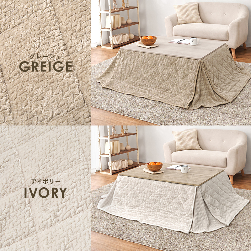 シンプルなデザインで天板リバーシブル、収納に便利な折れ脚コタツ。立体感のあるニット柄の省スペース掛け布団セット