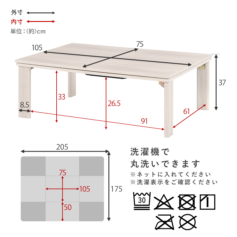 サイズ | こたつ:(約)幅105×奥行75×高さ37cm、掛ふとん:(約)205×175cm |