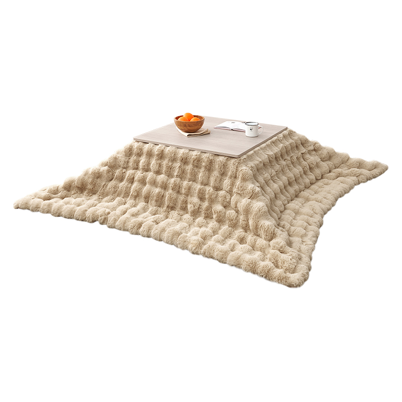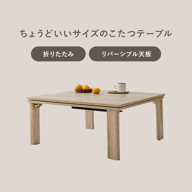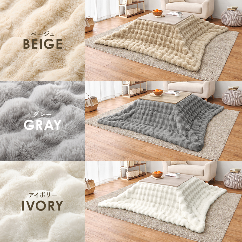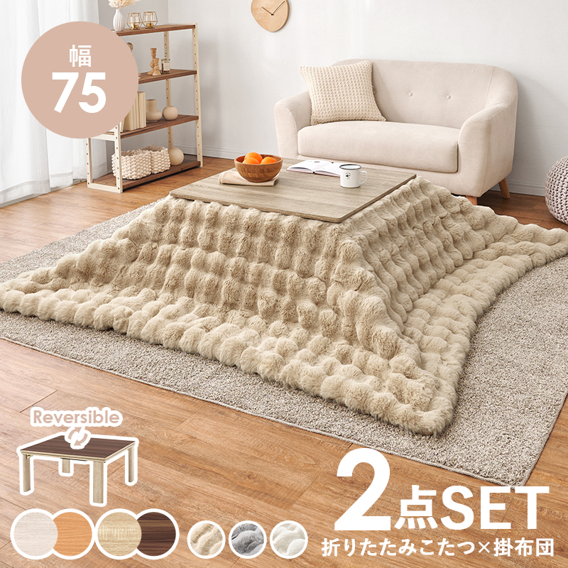 シンプルなデザインで天板リバーシブル、収納に便利な折れ脚コタツ。ラビットファーのような、ふわもこの掛け布団セット