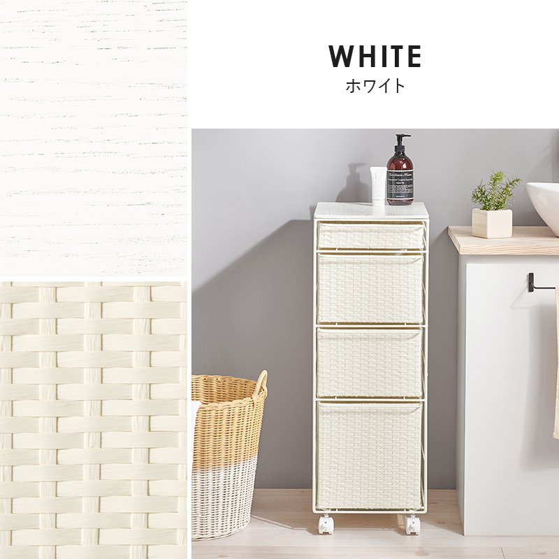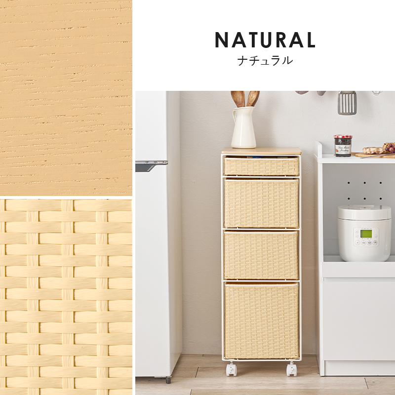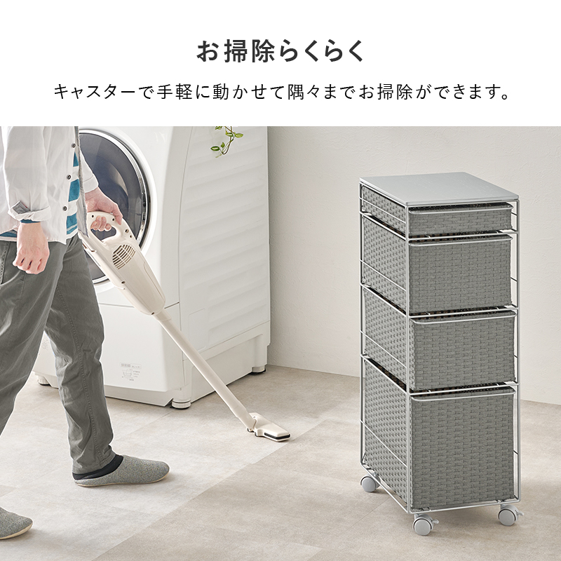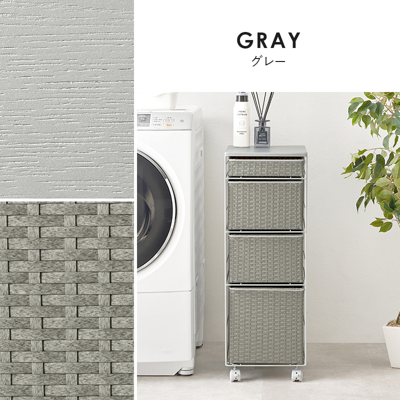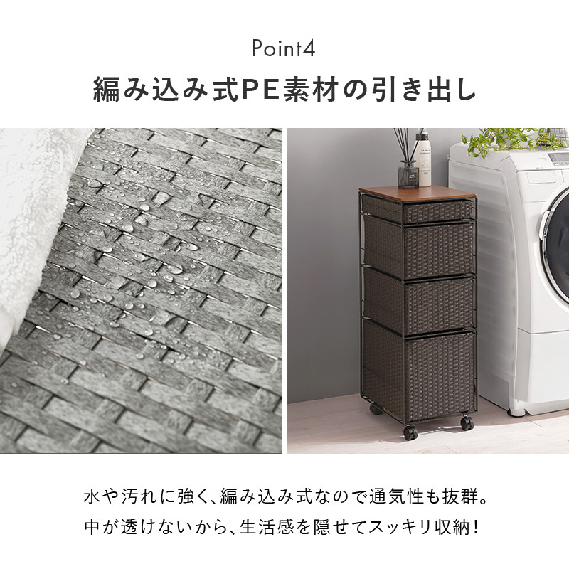 ランドリースペースやキッチンの隙間で使えるチェスト。樹脂素材を編んだ引出しは水や汚れに強く通気性も抜群。