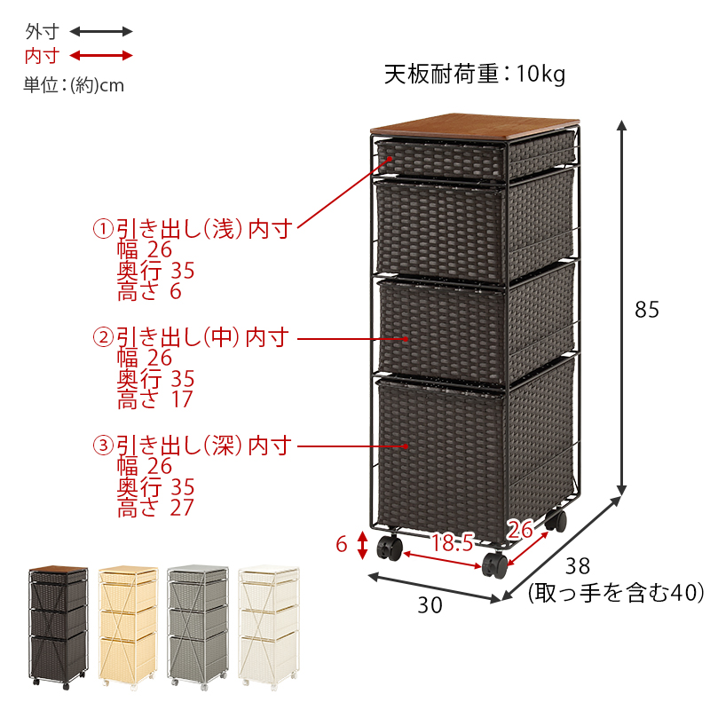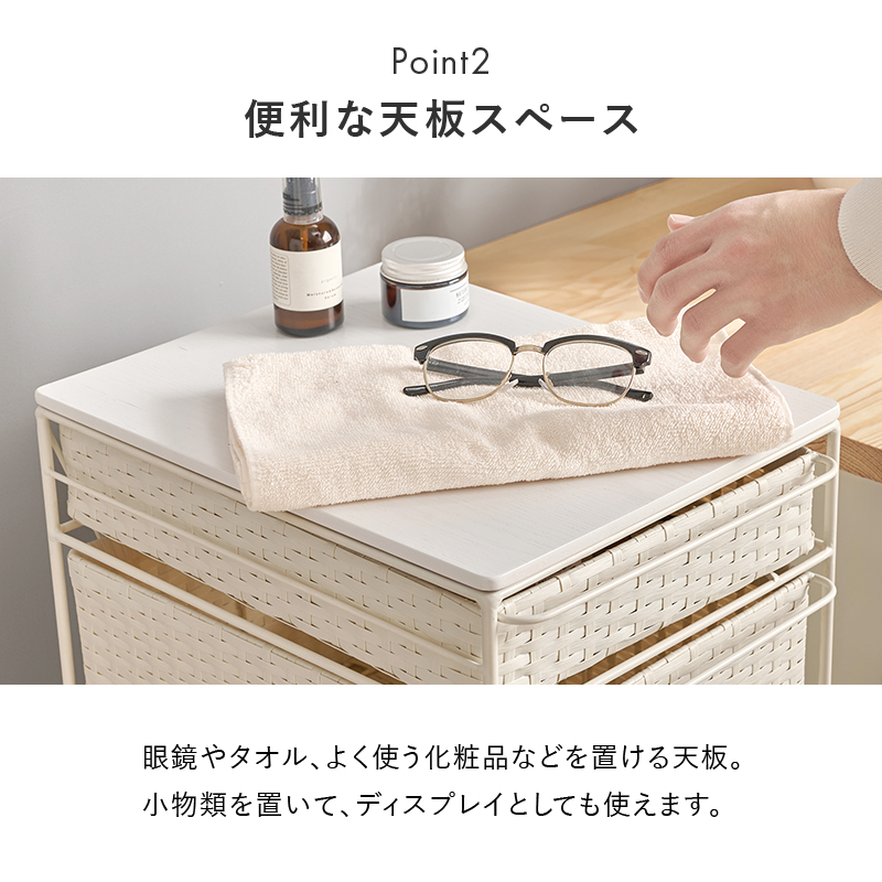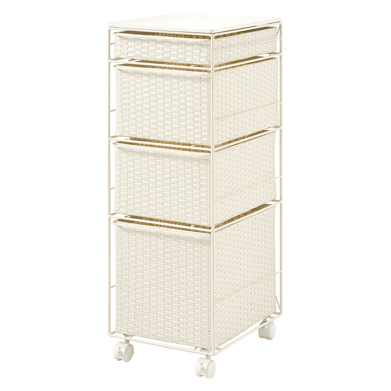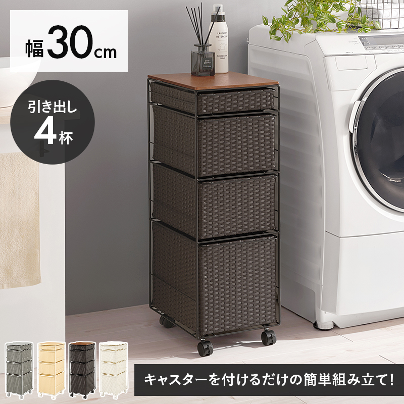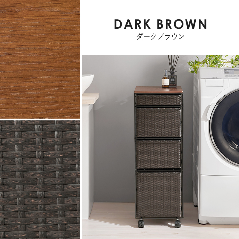 ランドリースペースやキッチンの隙間で使えるチェスト。樹脂素材を編んだ引出しは水や汚れに強く通気性も抜群。