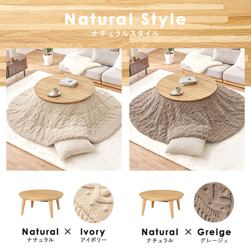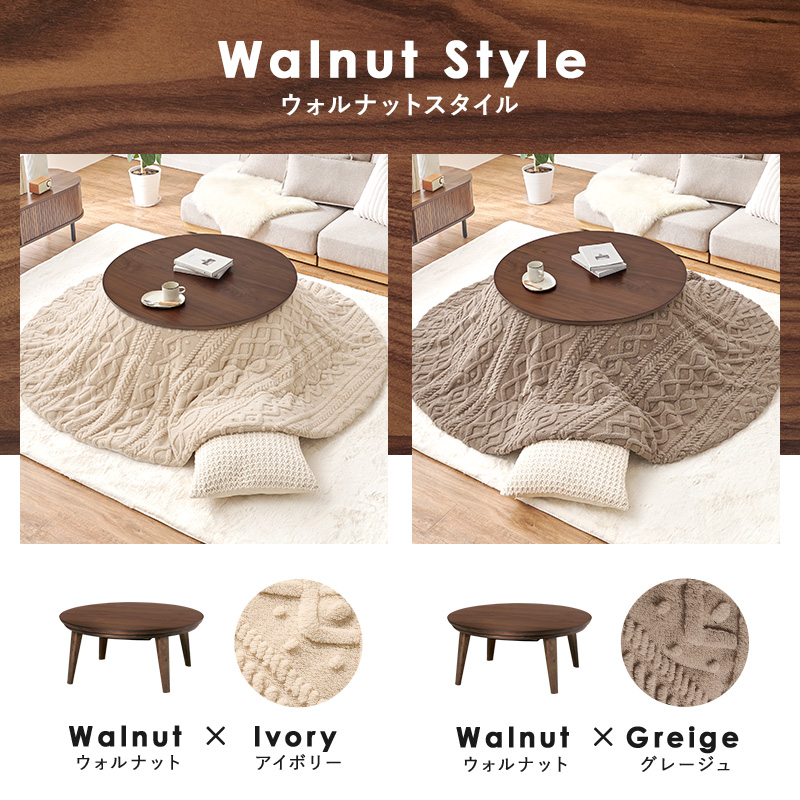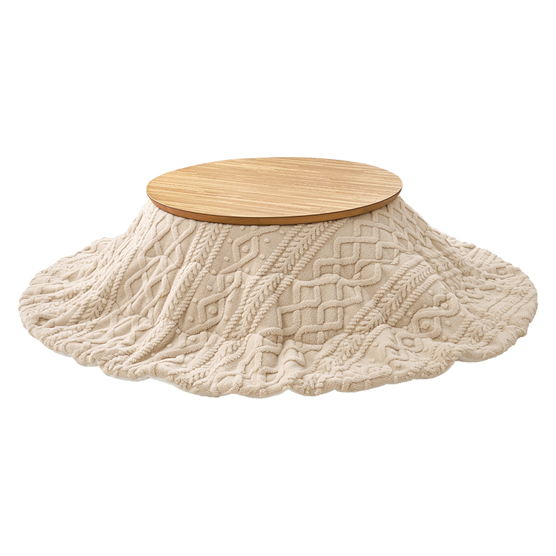 表情豊かな天然木突板を使用した洗練されたデザインの円形こたつです。セーターのような立体的なデザインがおしゃれな掛け布団セット