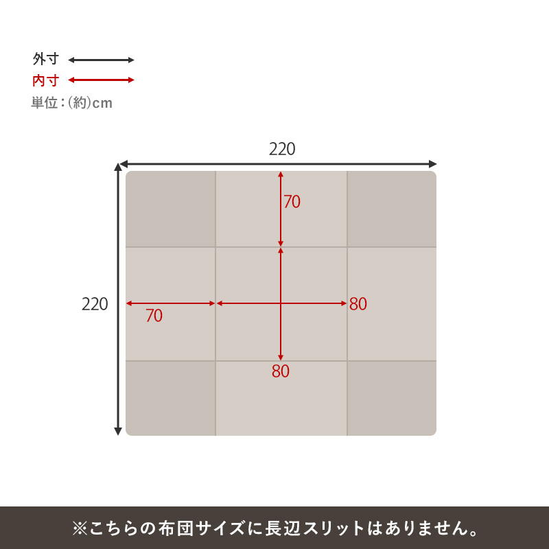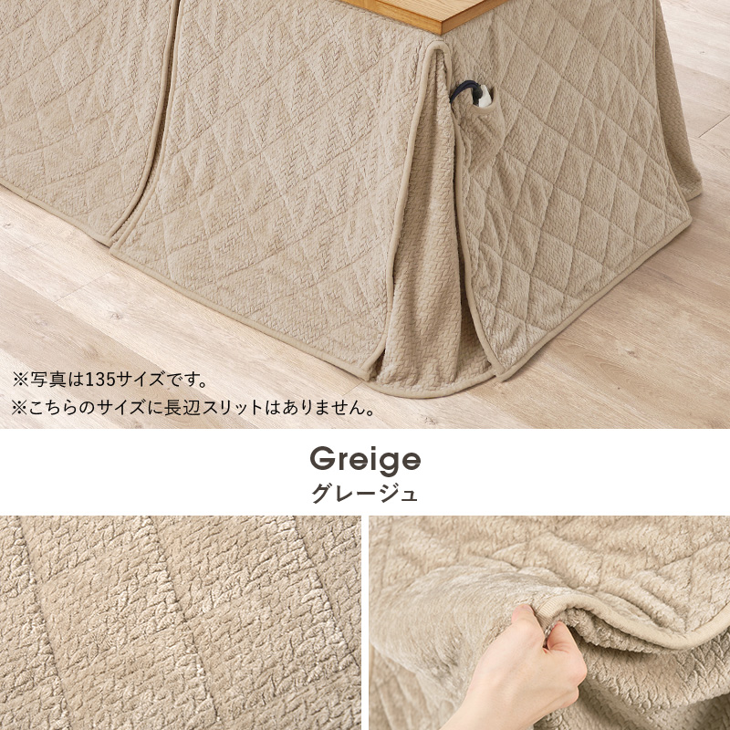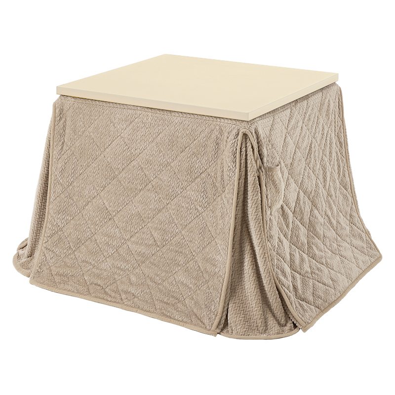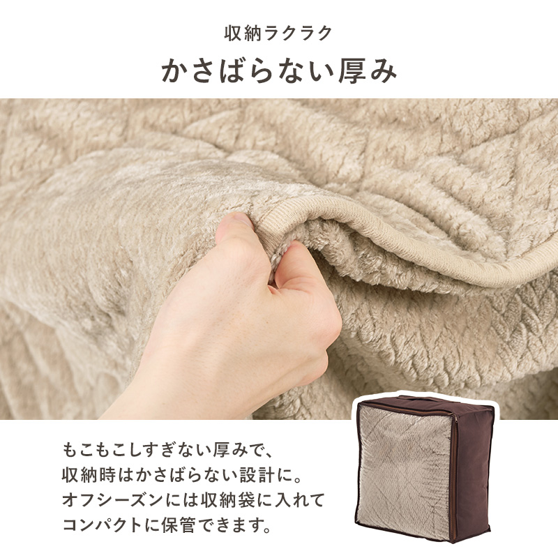 細かく編みこまれた立体感のあるニット柄が上品なこたつ布団。ダイニングタイプのこたつに合わせたこたつの熱を逃がしにくい省スペース仕様で、ヒーターのリモコンを入れるポケット付き。