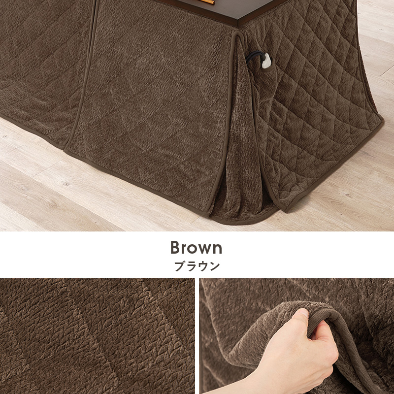 細かく編みこまれた立体感のあるニット柄が上品なこたつ布団。ダイニングタイプのこたつに合わせたこたつの熱を逃がしにくい省スペース仕様で、ヒーターのリモコンを入れるポケット付き。