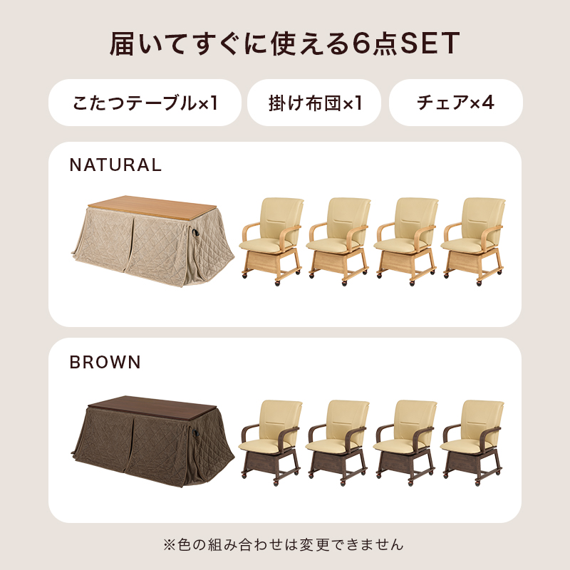 暖かく、立ち座りがしやすく、インテリアに馴染むデザインのダイニングこたつ。立体感のあるニット柄の省スペース掛け布団が付いた6点セット