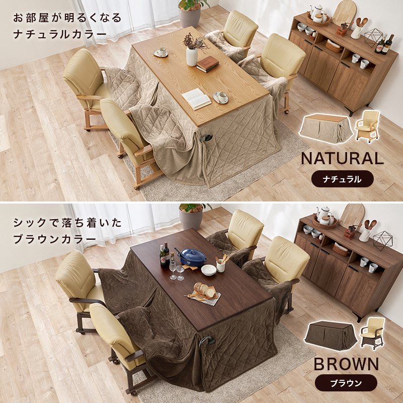 素材 | こたつ:<天板><ブラウン>ウォールナット突板<ナチュラル>アッシュ突板、塗装:ウレタン樹脂塗装(UV加工) <脚部>ラバーウッド 、ヒーター:NN-8065 600W石英管ヒーター(手元コントローラー)、ふとん:< 側地><中材>ポリエステル100%、チェア:<フレーム>天然木<張地>合成皮革 |