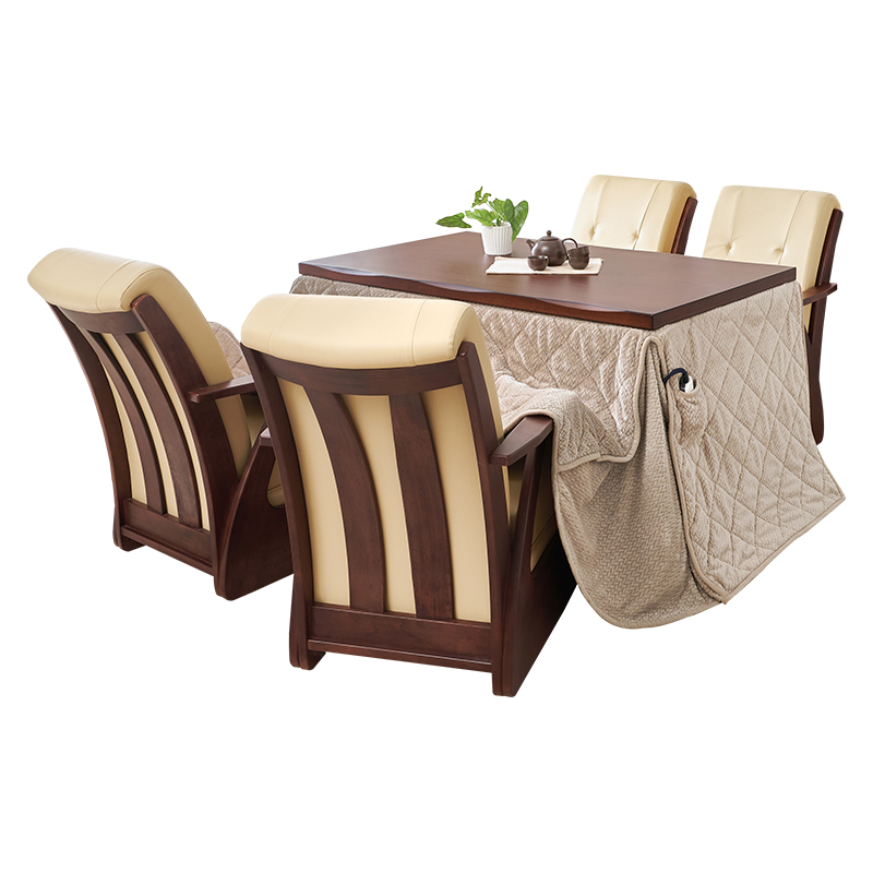 天板、脚に和風のなぐり加工を施した高級感あふれるダイニングこたつテーブル。座る環境に合わせて天板高さを4段階に調節可能な多段継脚タイプです。立体感のあるニット柄の省スペース掛け布団セット