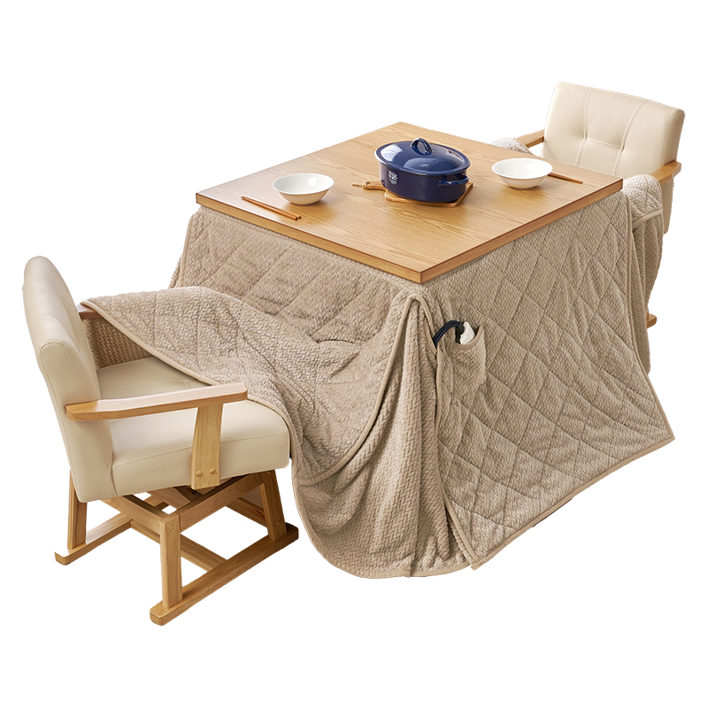 素材 | こたつ:<天板>天然木化粧繊維板・UV塗装<脚部>ラバーウッド、ヒーター:MHU-601E(D) 600Wハロゲンヒーター(手元コントローラー付)、ふとん:< 側地><中材>ポリエステル100%、チェア:<木部>ラバーウッド<張地>合成皮革 |