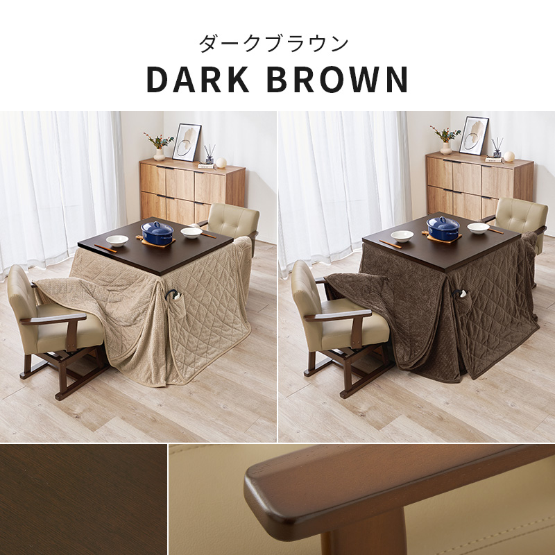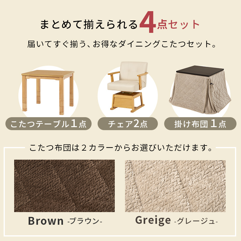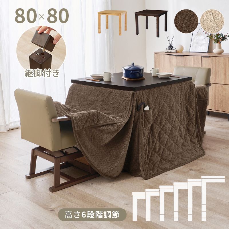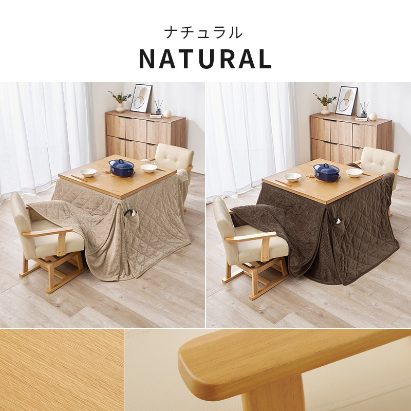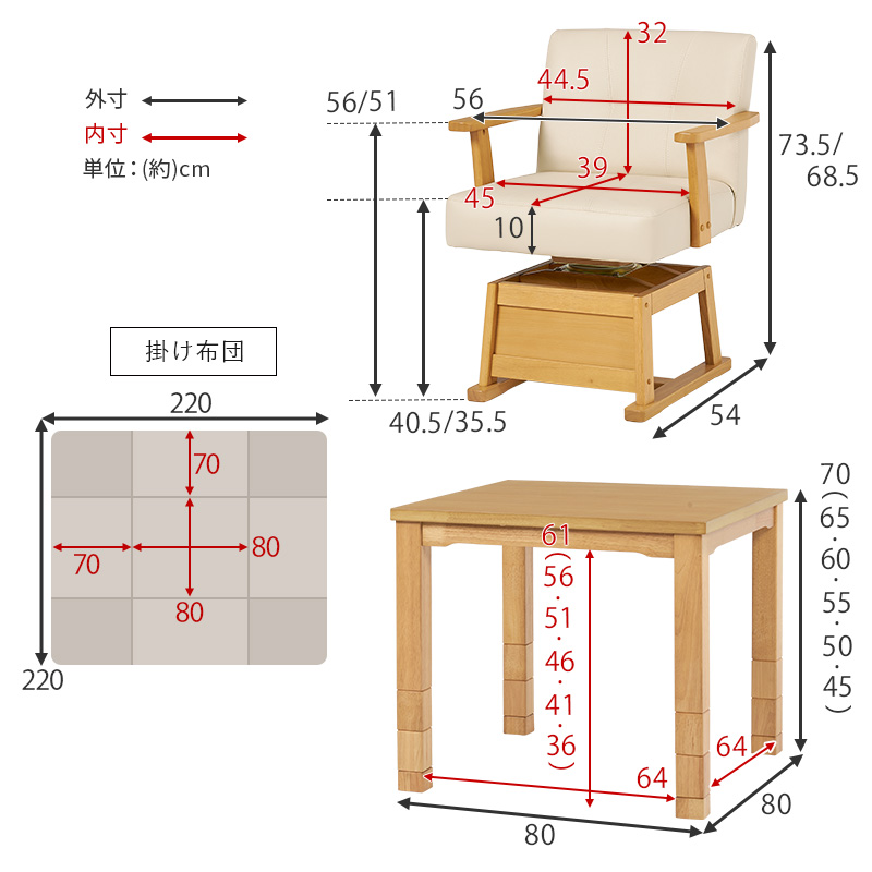 サイズ | こたつ:(約)幅80×奥行80×高さ45/50/55/60/65/70cm、ふとん:(約)幅80×奥行80×高さ70cm、チェア:(約)幅56×奥行54×高さ73.5/68.5×座面高40.5/35.5cm |