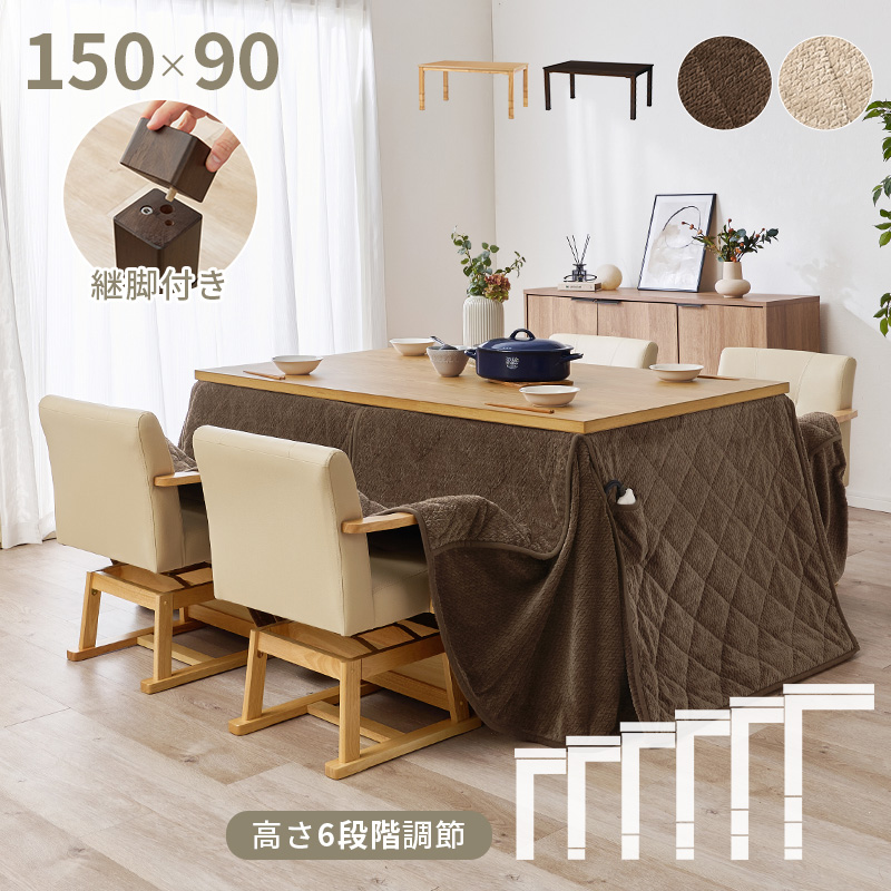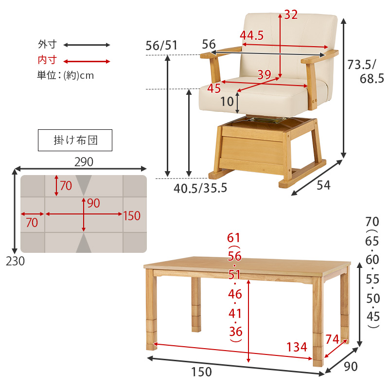 サイズ | こたつ:(約)幅150×奥行90×高さ45/50/55/60/65/70cm、ふとん:(約)幅150×奥行90×高さ70cm、チェア:(約)幅56×奥行54×高さ73.5/68.5×座面高40.5/35.5cm |