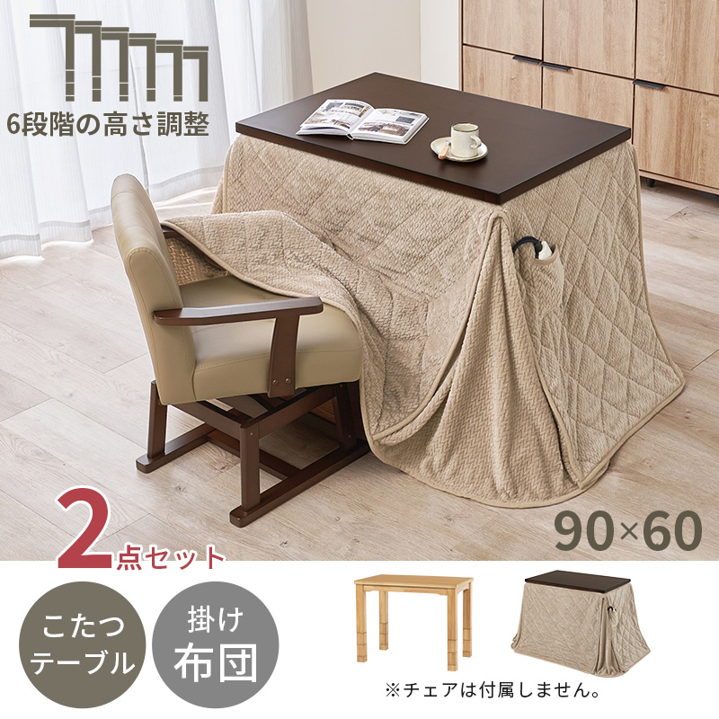 高さが6段階に変更できるこたつテーブル。ダイニングチェア、ソファなどお使いの家具に合わせた高さに変更できます。ダイニング高さでも使える省スペース掛け布団セット