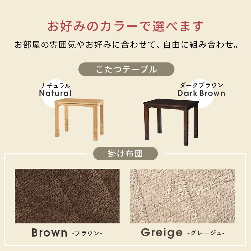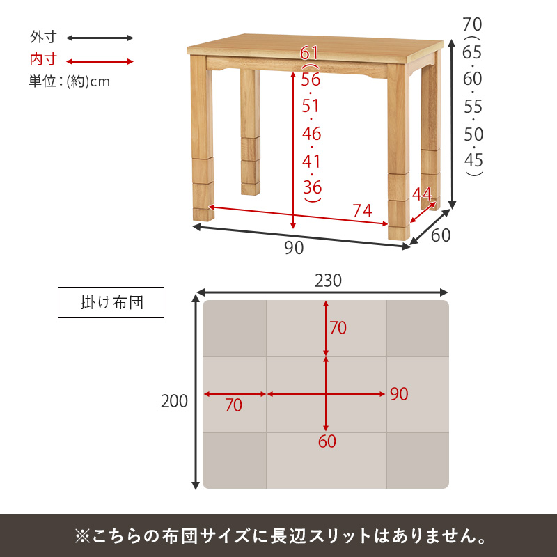 サイズ | こたつ:(約)幅90×奥行60×高さ45/50/55/60/65/70cm、ふとん:(約)幅90×奥行60×高さ70cm |