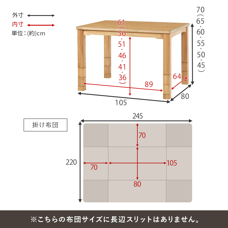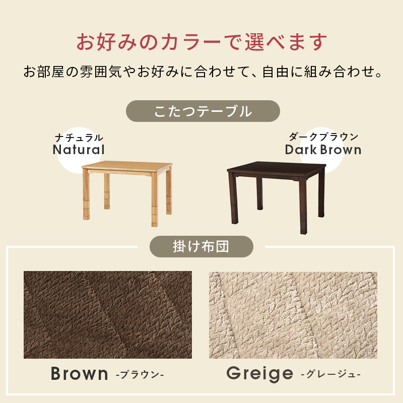 サイズ | こたつ:(約)幅105×奥行80×高さ45/50/55/60/65/70cm、ふとん:(約)幅105×奥行80×高さ70cm |