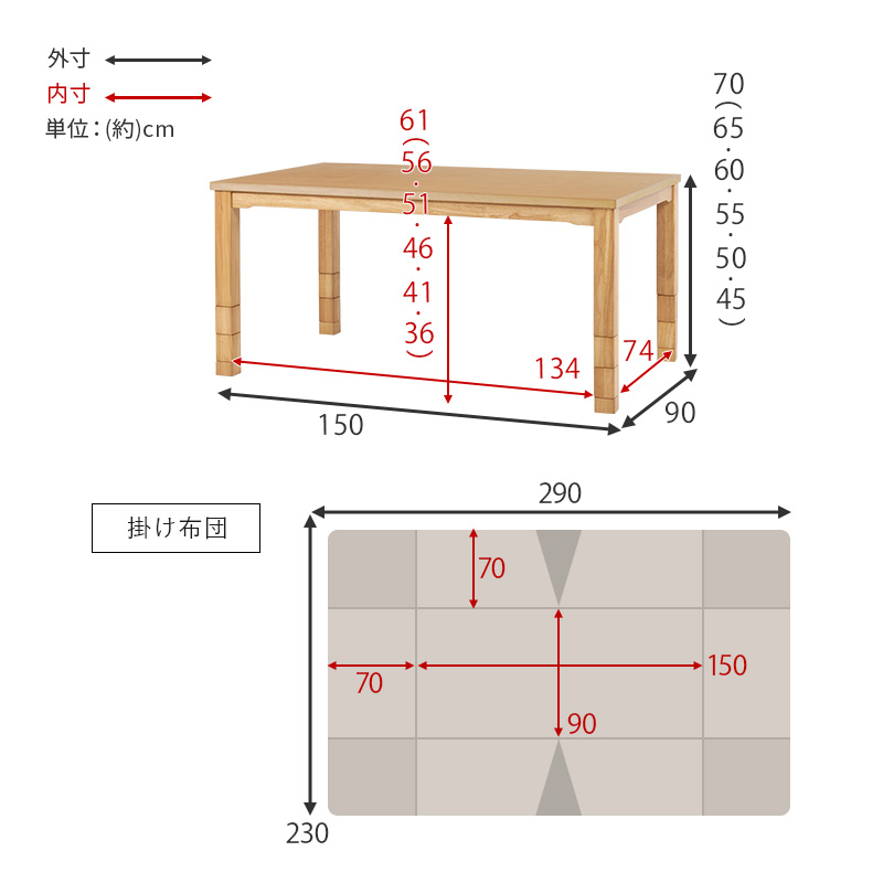 サイズ | こたつ:(約)幅150×奥行90×高さ45/50/55/60/65/70cm、ふとん:(約)幅150×奥行90×高さ70cm |