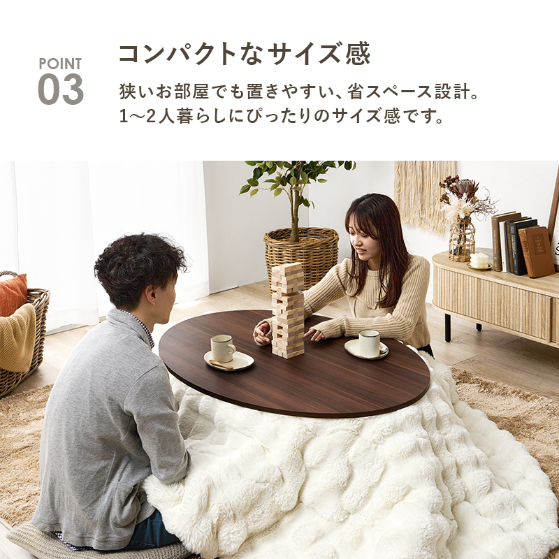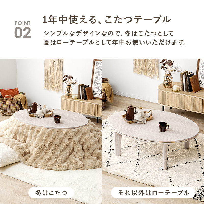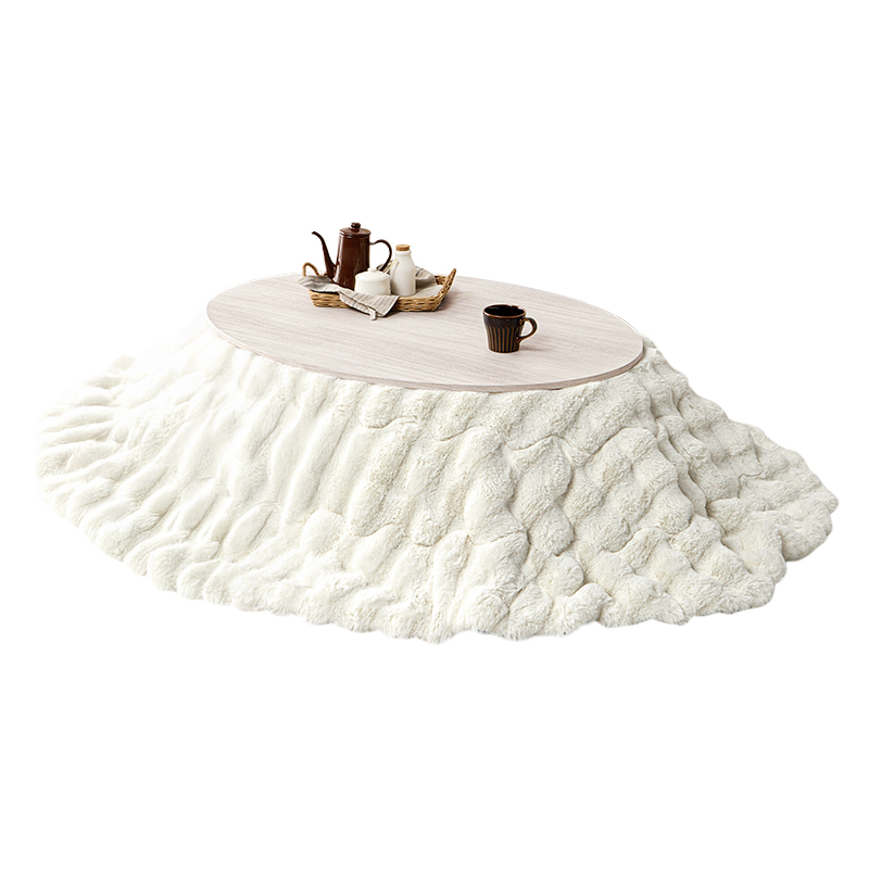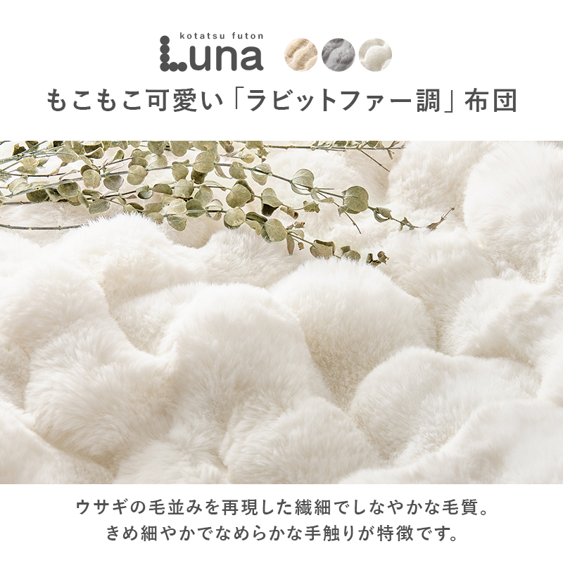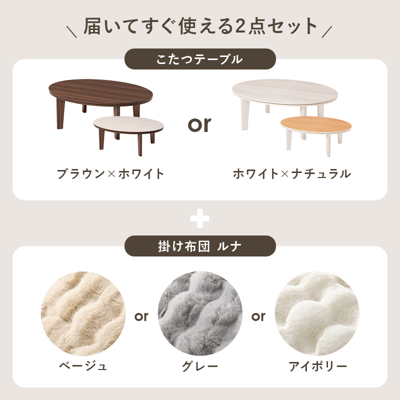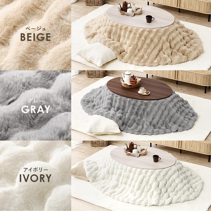 天板がリバーシブルでオールシーズン活躍するカジュアルコタツ。ラビットファーのような、ふわもこの掛け布団セット
