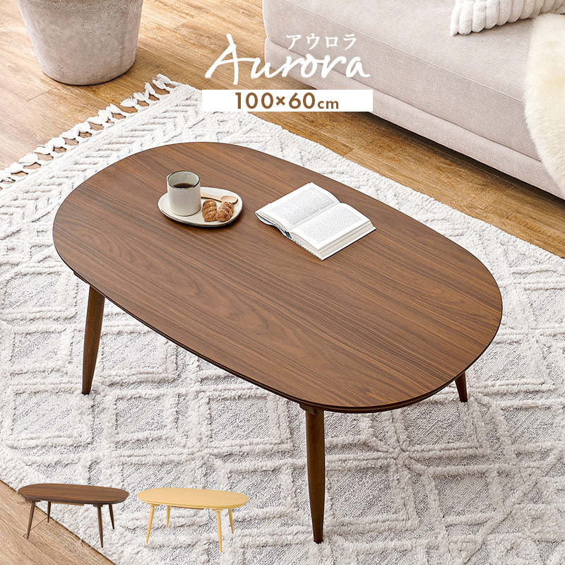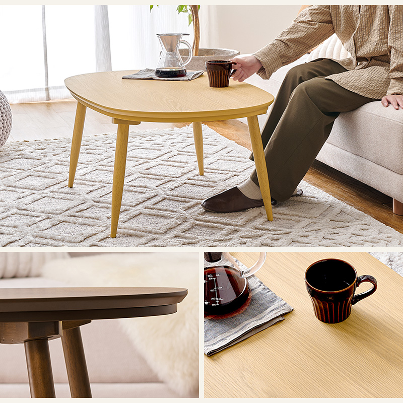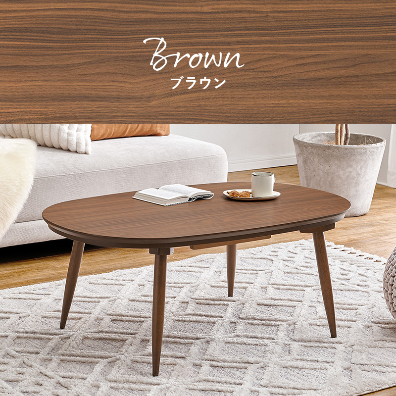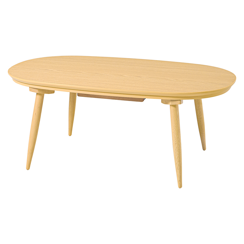 あたたかみのある木目調のナチュラルデザイン。丸みが美しいオーバル型の天板にシャープな脚を合わせたこたつテーブルです。