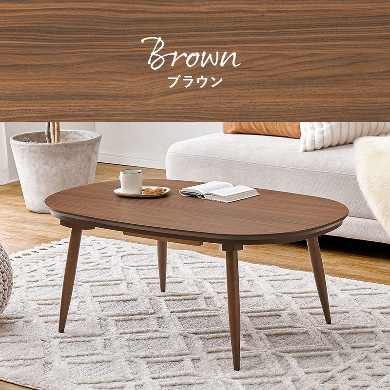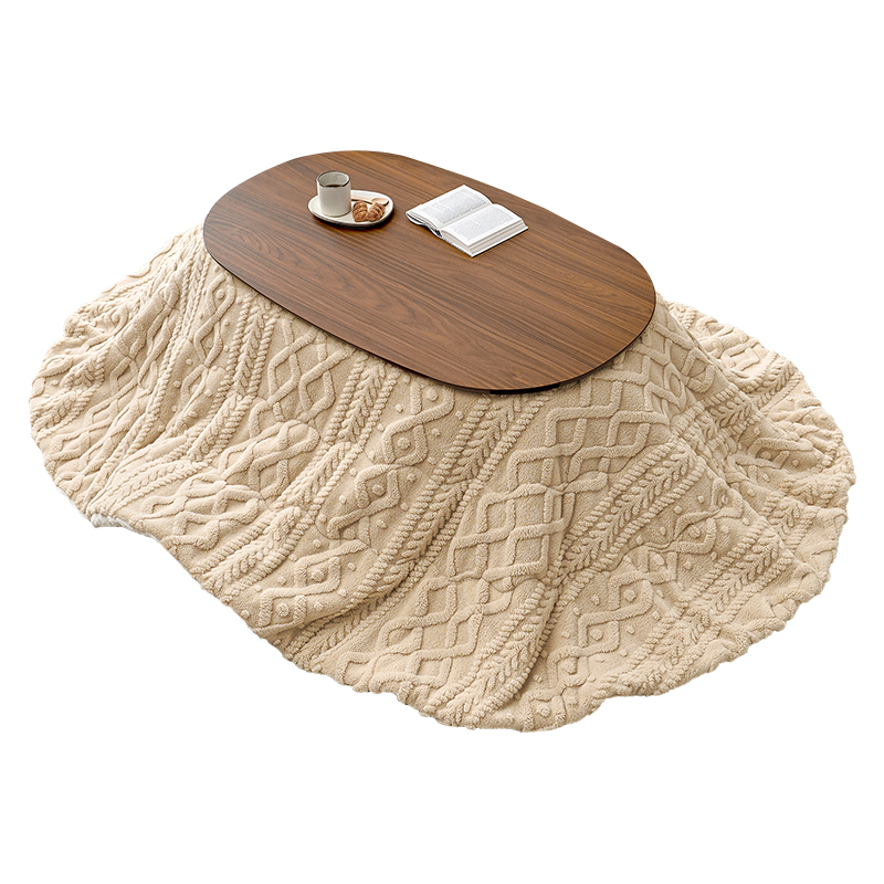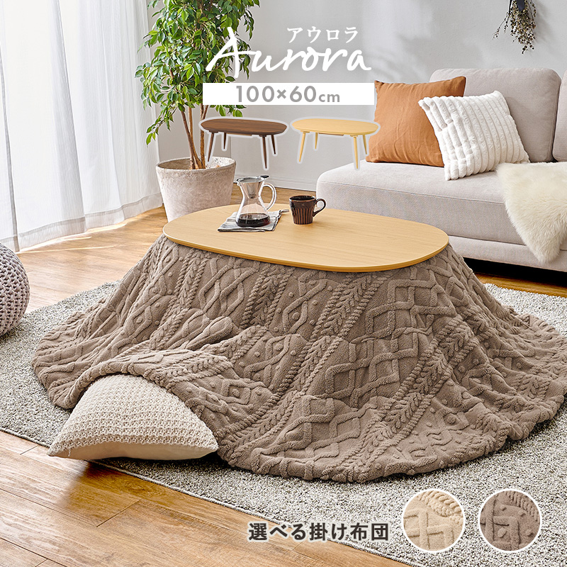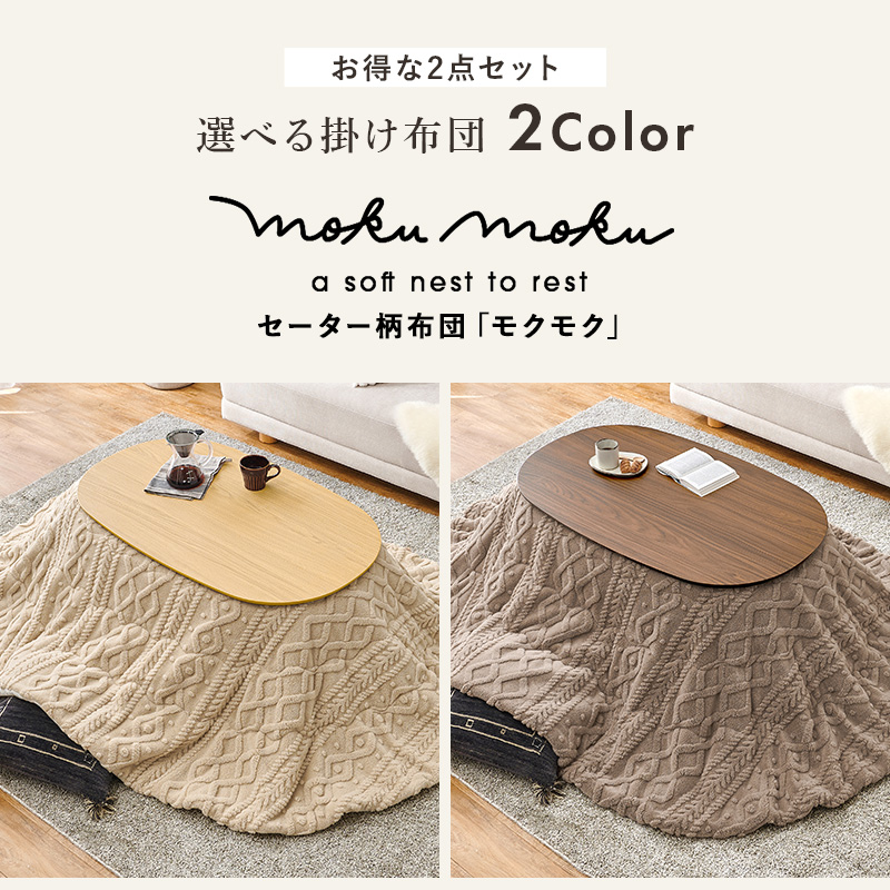 あたたかみのある木目調のナチュラルデザイン。丸みが美しいオーバル型の天板にシャープな脚を合わせたこたつテーブルとセーターのような立体的なデザインがおしゃれな掛け布団セット
