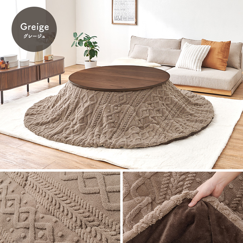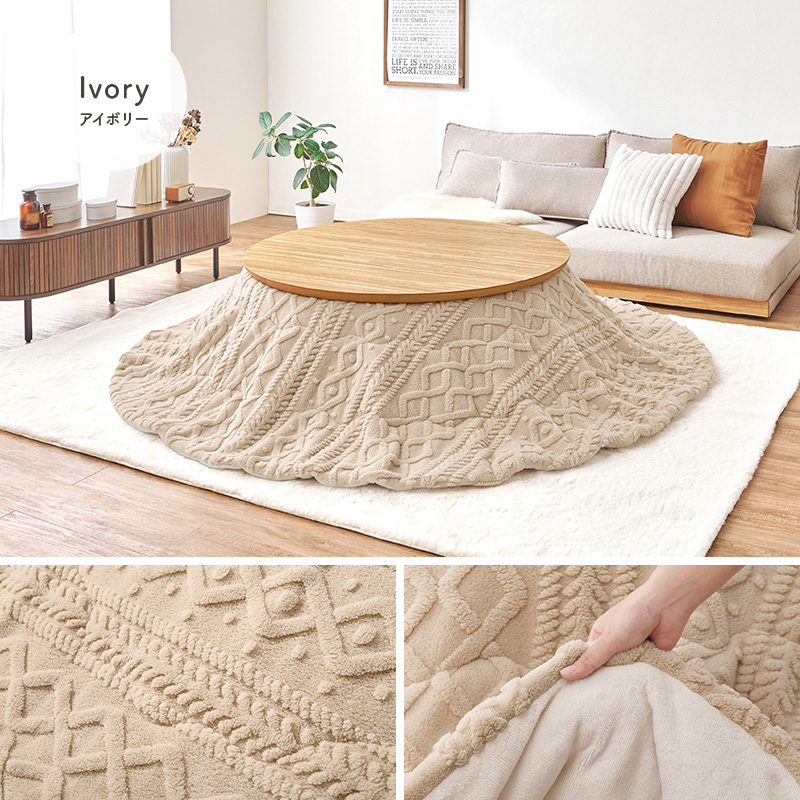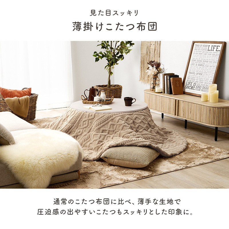 ケーブルニットのセーターのような立体的なデザインがおしゃれな薄掛け布団。もこもこしすぎない厚みでコンパクトに収納可能。洗濯可能