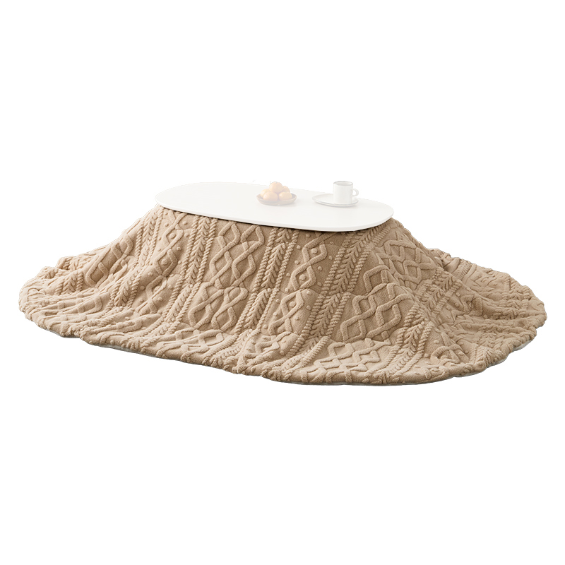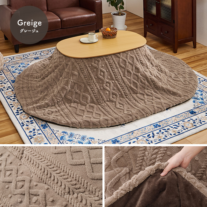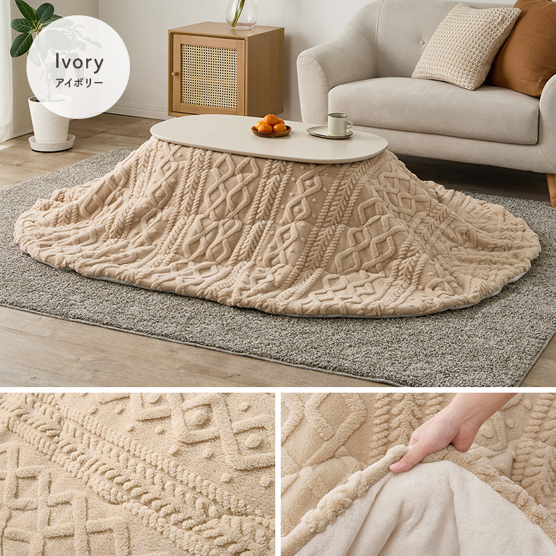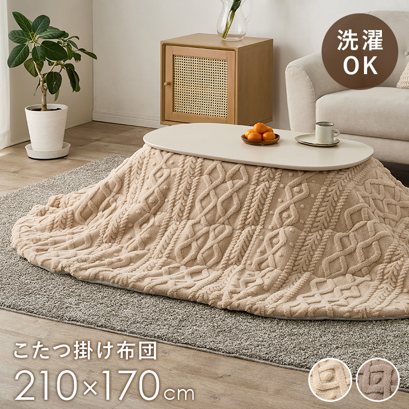 ケーブルニットのセーターのような立体的なデザインがおしゃれな薄掛け布団。もこもこしすぎない厚みでコンパクトに収納可能。洗濯可能