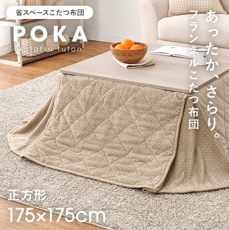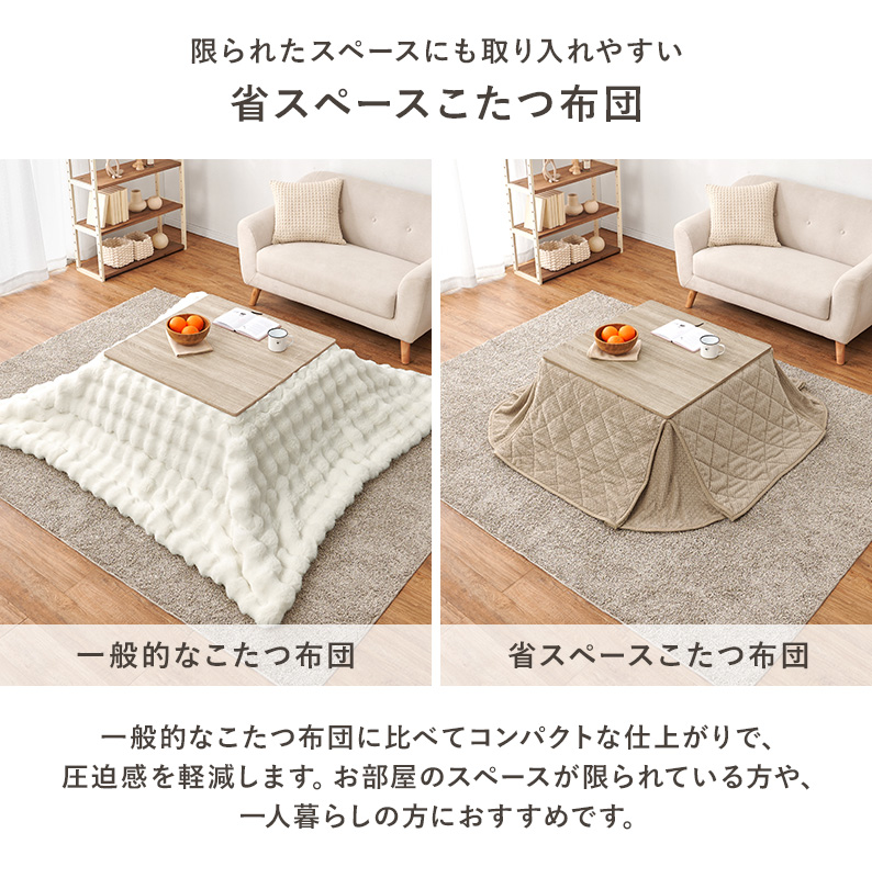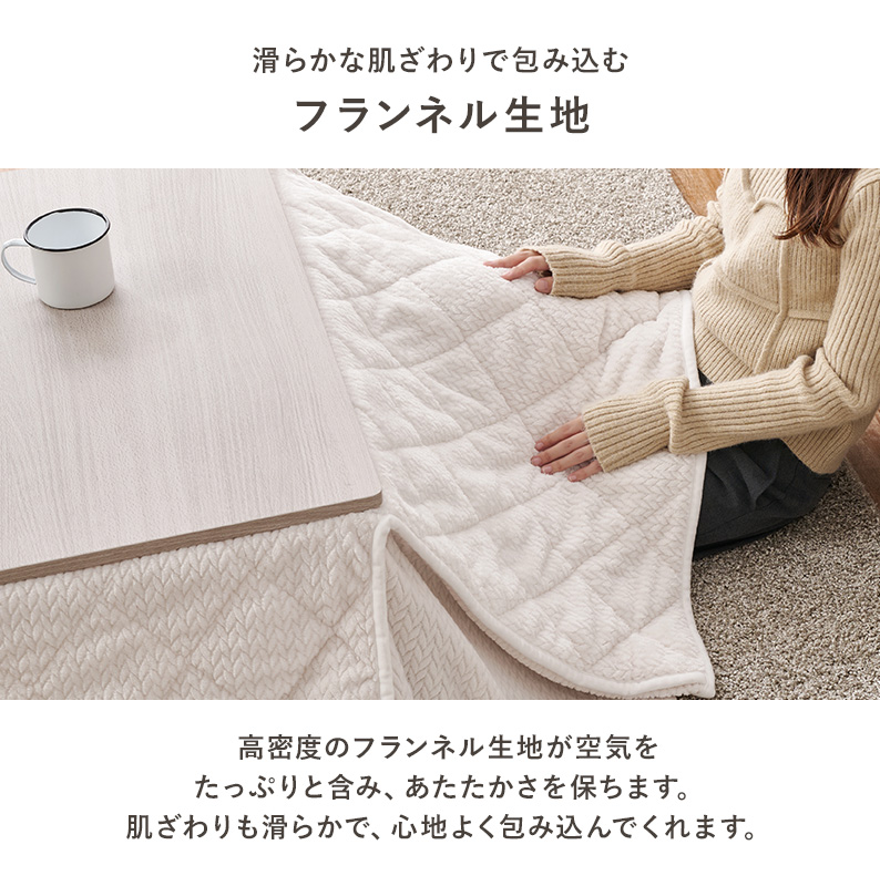 細かく編みこまれた立体感のあるニット柄が上品なこたつ布団。四隅にスリットが入った省スペースタイプなので、お部屋の圧迫感を軽減します。洗濯可能