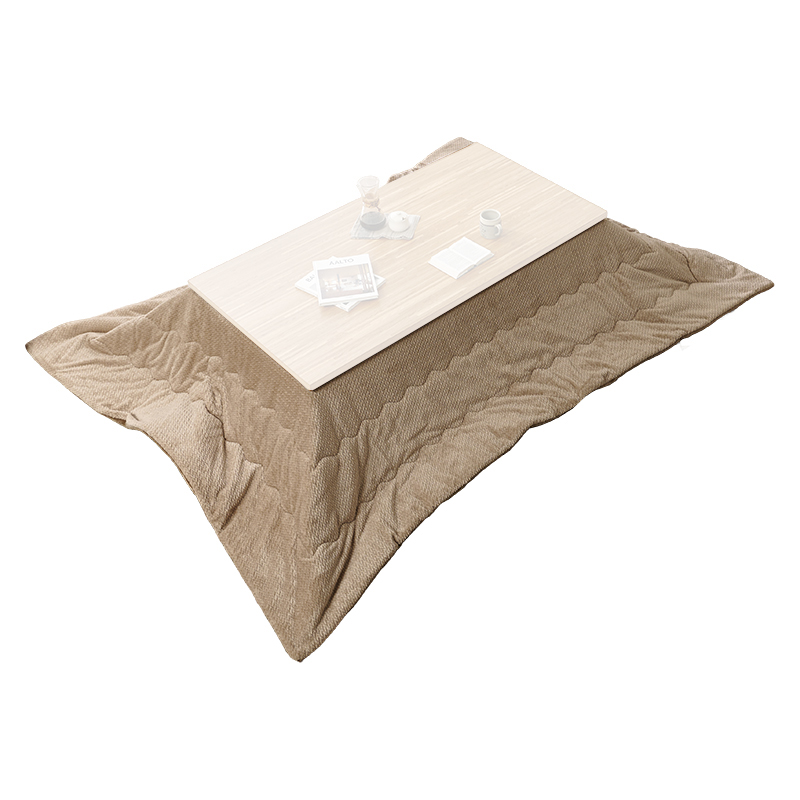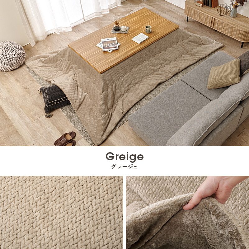 細かく編みこまれた立体感のあるニット柄が上品なこたつ布団。もこもこしすぎない厚みでコンパクトに収納可能。洗濯可能