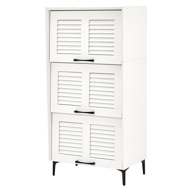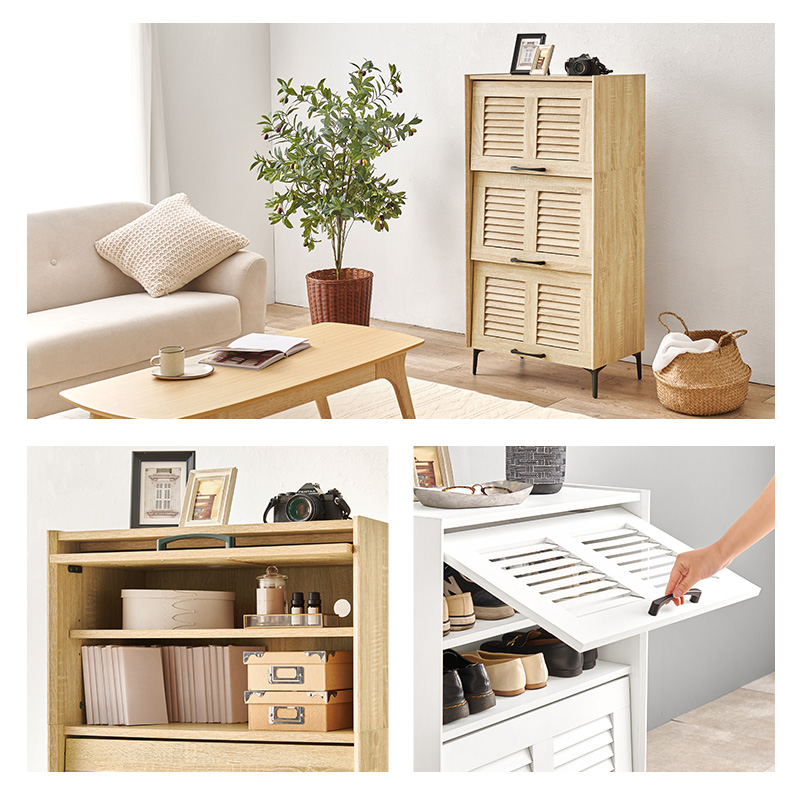通気性の良いルーバー扉のシューズラック。可動棚付きで大きめの靴も収納でき、スッキリとしたスチール脚はリビングの収納としてもおしゃれに使えます。