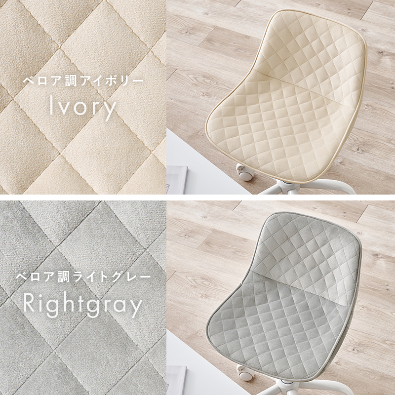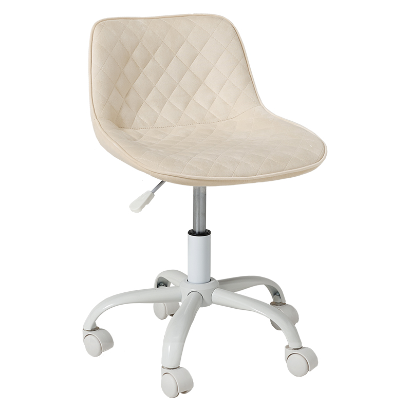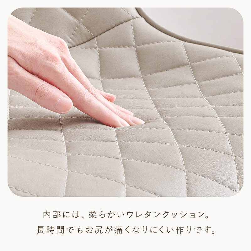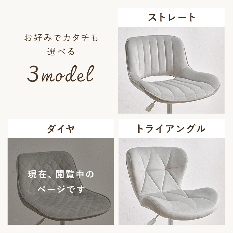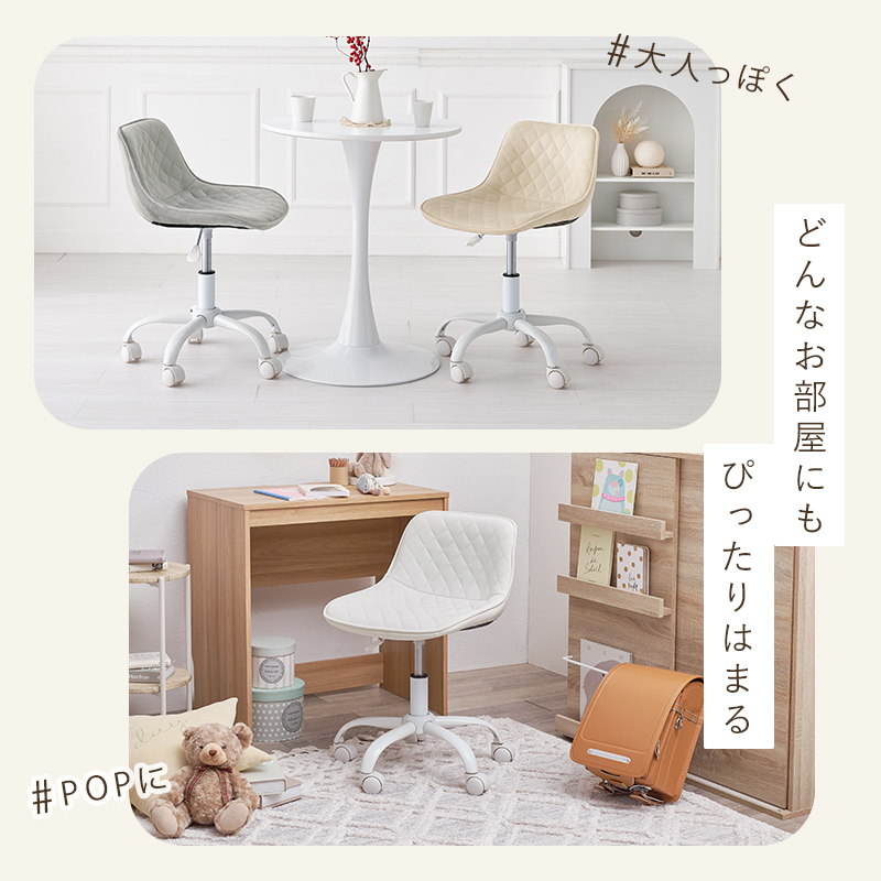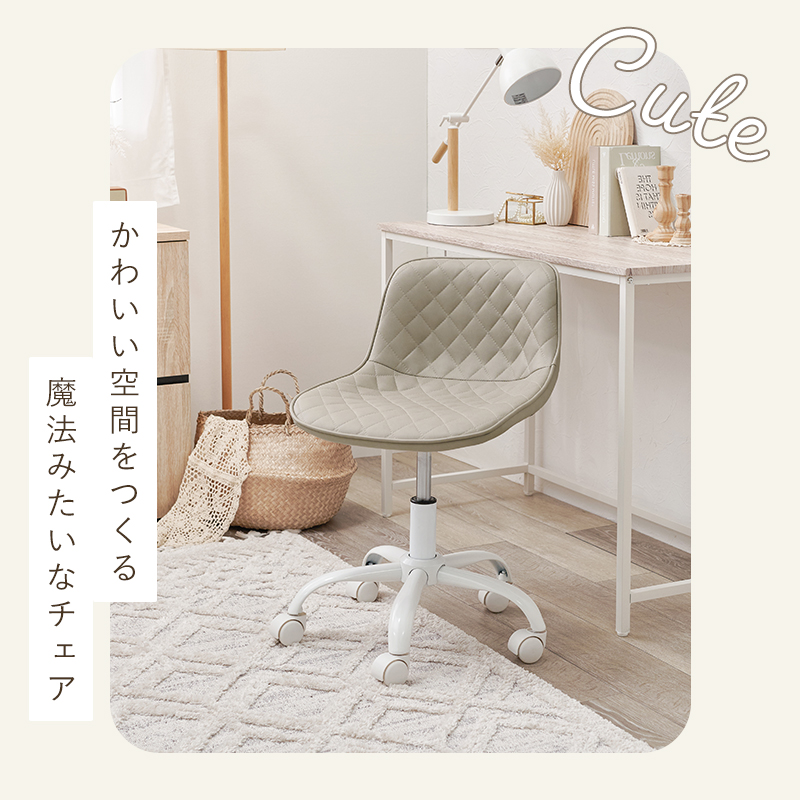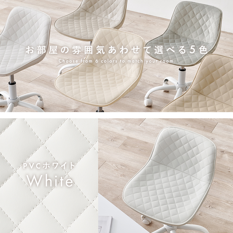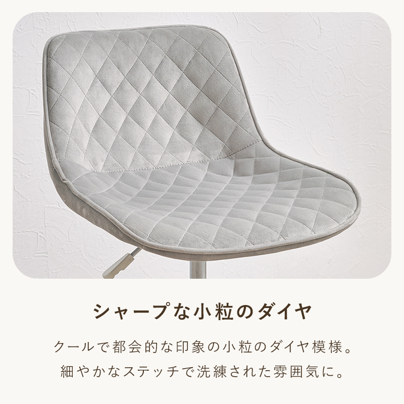 かわいいホワイトの足元に、シャープな小粒のダイヤ模様の座面が洗練された雰囲気のチェア。背もたれや座面はやわらかくカーブしており身体の丸みに優しくフィットします。小柄な人にも嬉しい低め設計。
