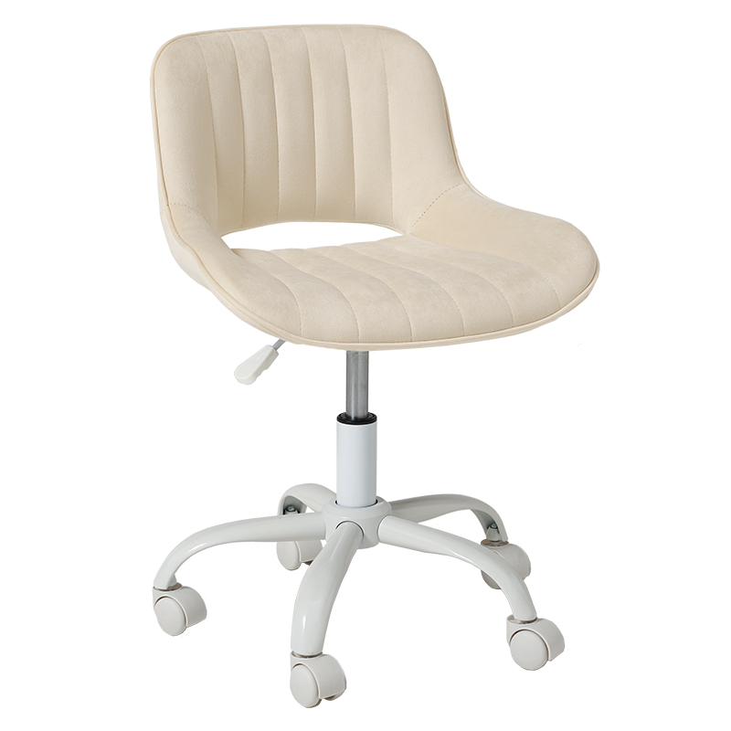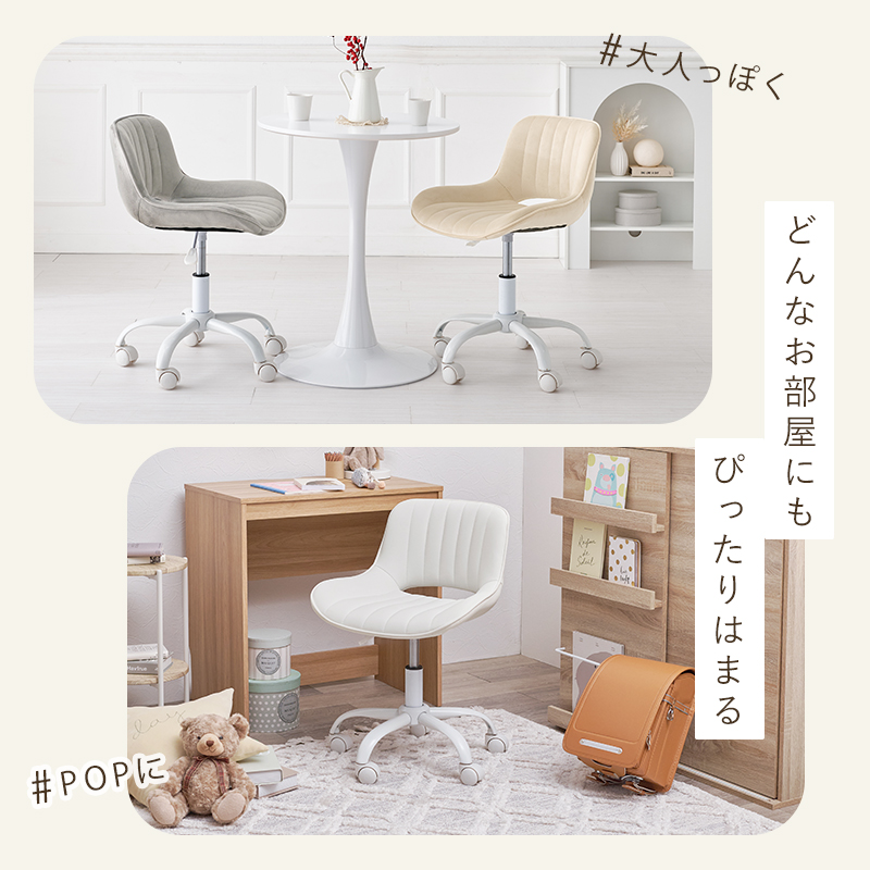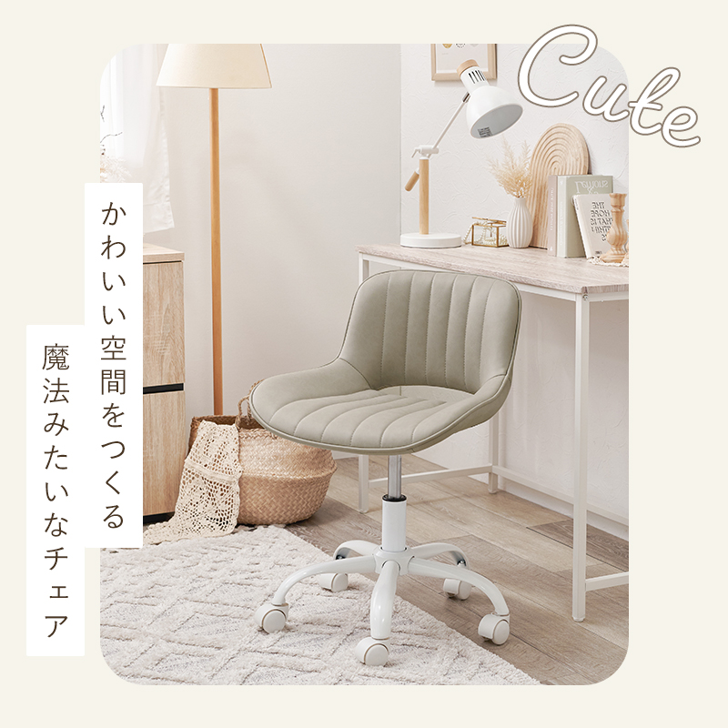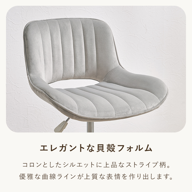 かわいいホワイトの足元に、上品なストライプ柄が貝殻のような座面を合わせたチェア。背もたれや座面はやわらかくカーブしており身体の丸みに優しくフィットします。小柄な人にも嬉しい低め設計。