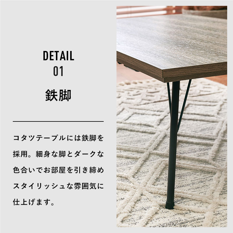 グレイッシュな木目調天板とスチール脚がブルックリンスタイルを感じさせるコタツテーブル。立体感のあるニット柄の掛け布団セット