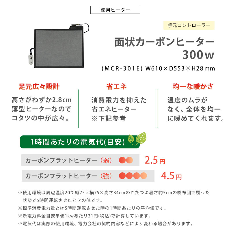 | 素材 | こたつ:<天板>合成樹脂化粧繊維板(PVCシート)<脚部>スチール、ヒーター:MCR-301E 300Wフラットカーボンヒーター(手元コントローラー付)、ふとん:< 側地><中材>ポリエステル100% |