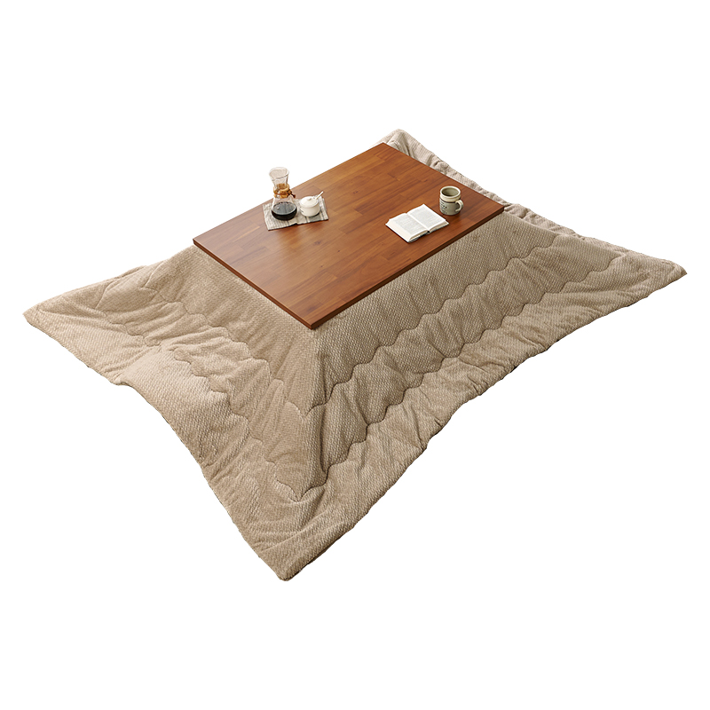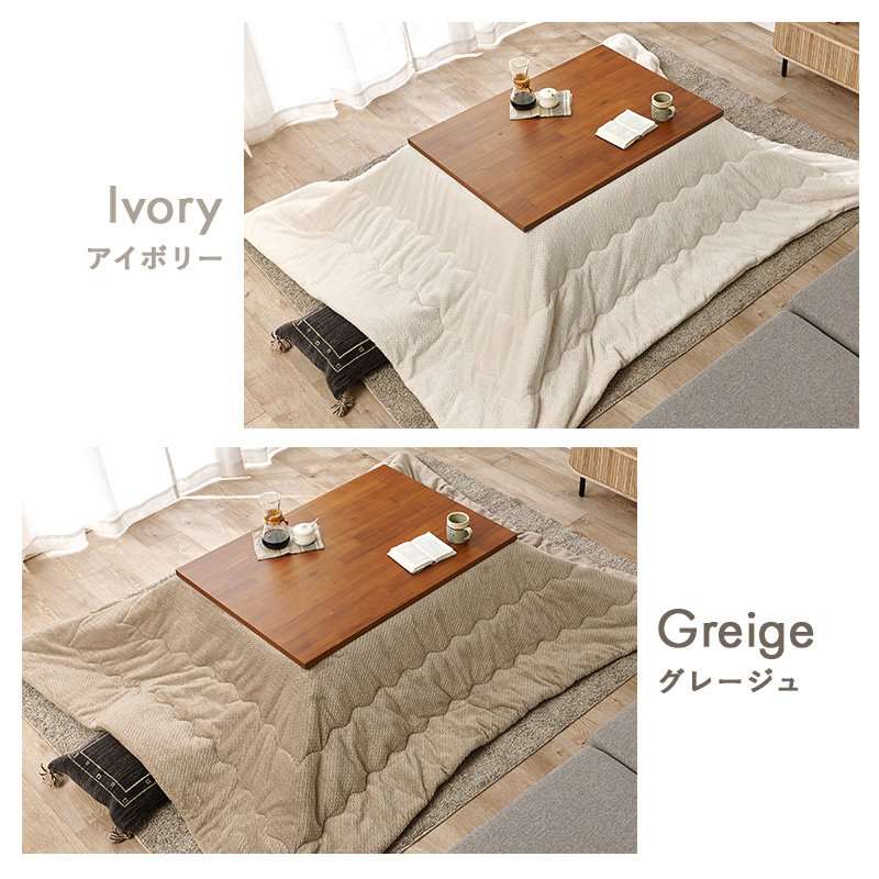 天然木アカシアの集成材突板を使用し、味のある風合いを楽しめるこたつテーブル。立体感のあるニット柄の掛け布団セット