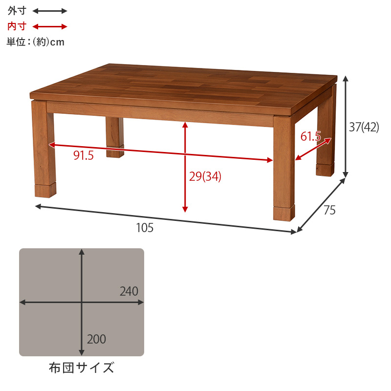 | サイズ | こたつ:(約)幅105×奥行75×高さ37/42cm、ふとん:(約)240×200cm |